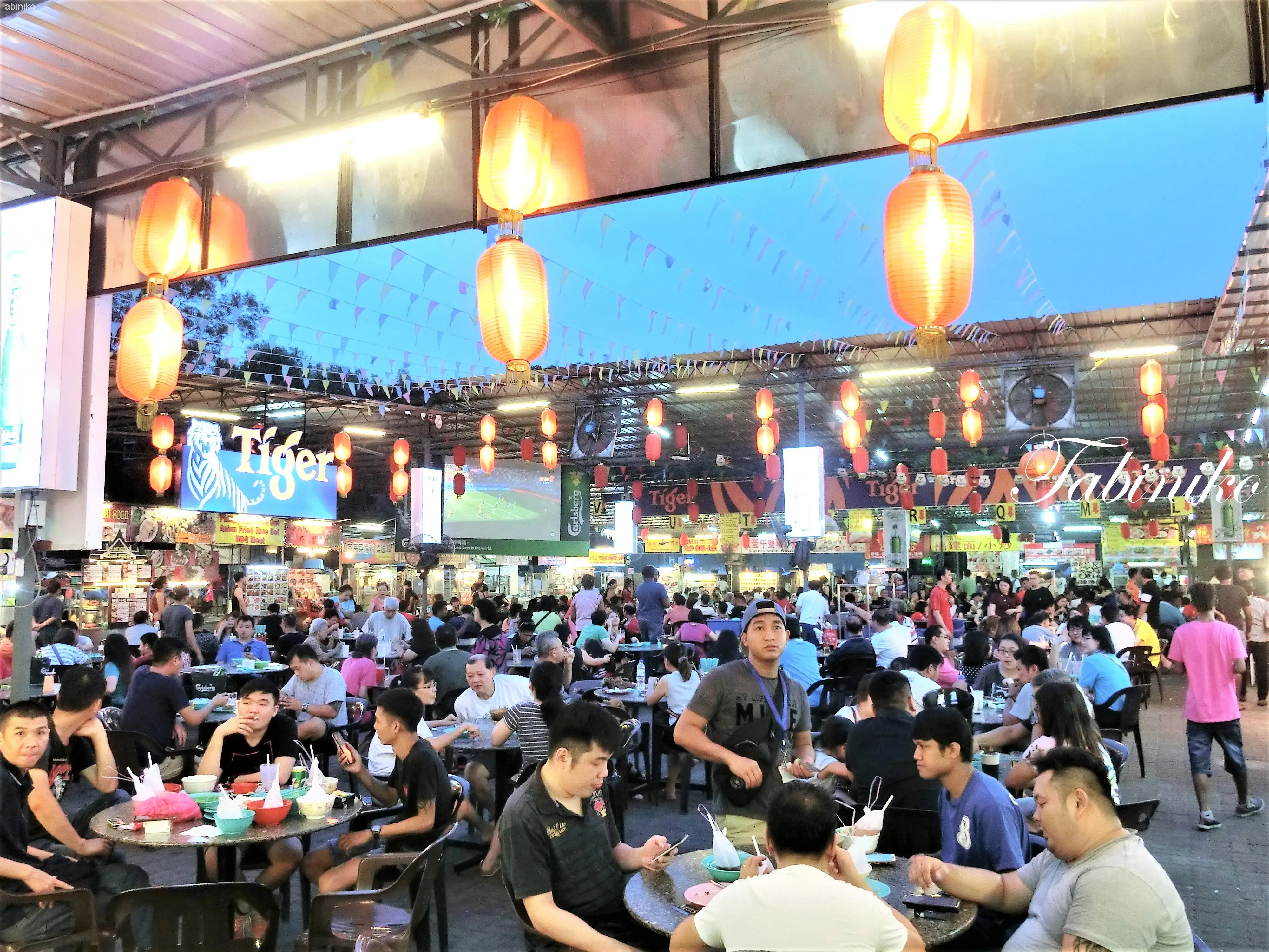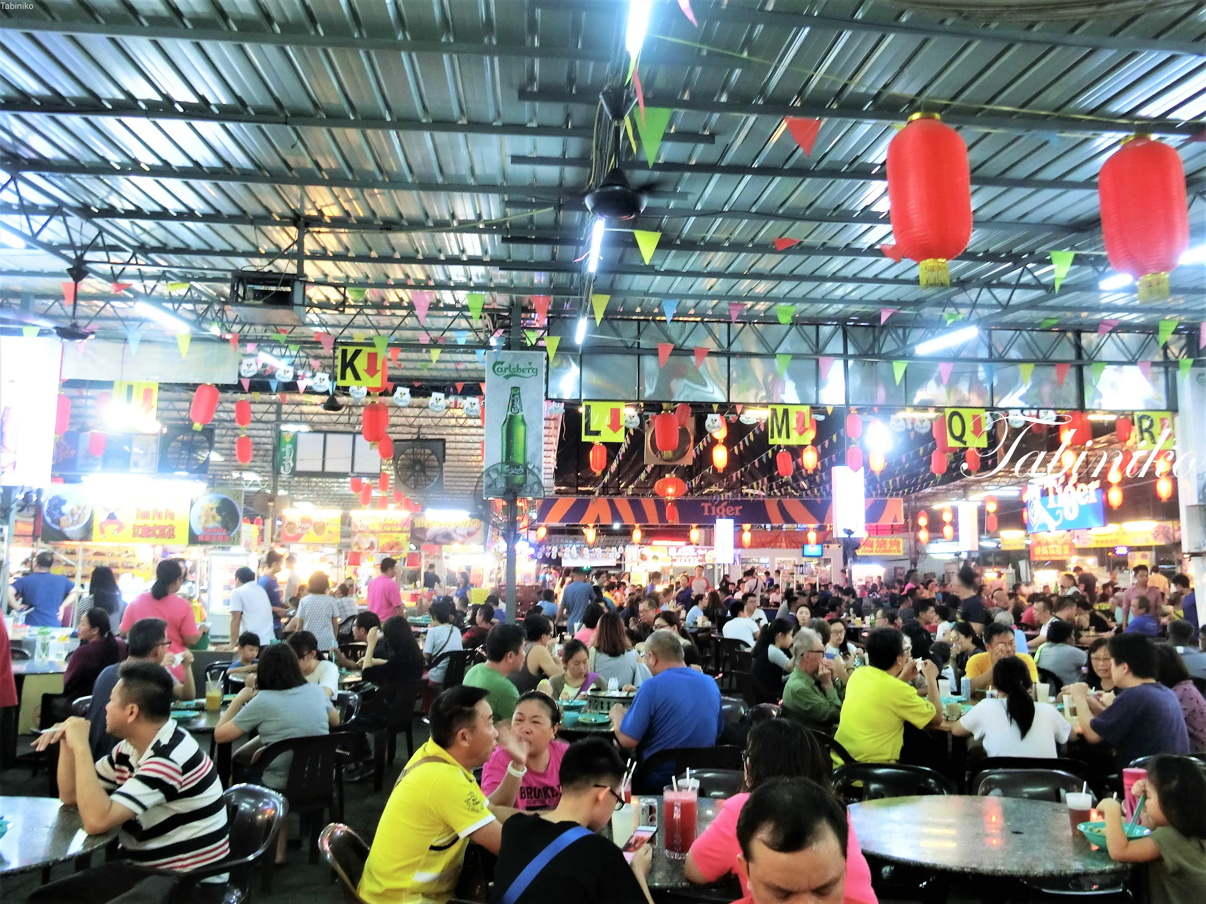 見渡す限り、人人人!!!大人気の屋台街です。たくさんの屋台が並んでいて、いろいろな種類の食べ物が楽しめます。