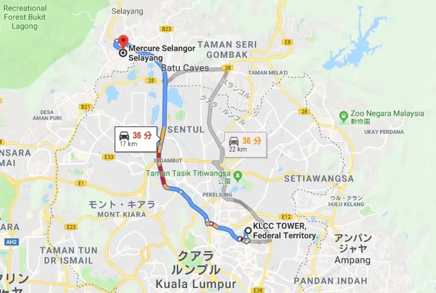 ・ツインタワー KLCCやブッキ・ビンタン(Bukit Bintang)などの繁華街までは車で約30分から40分。