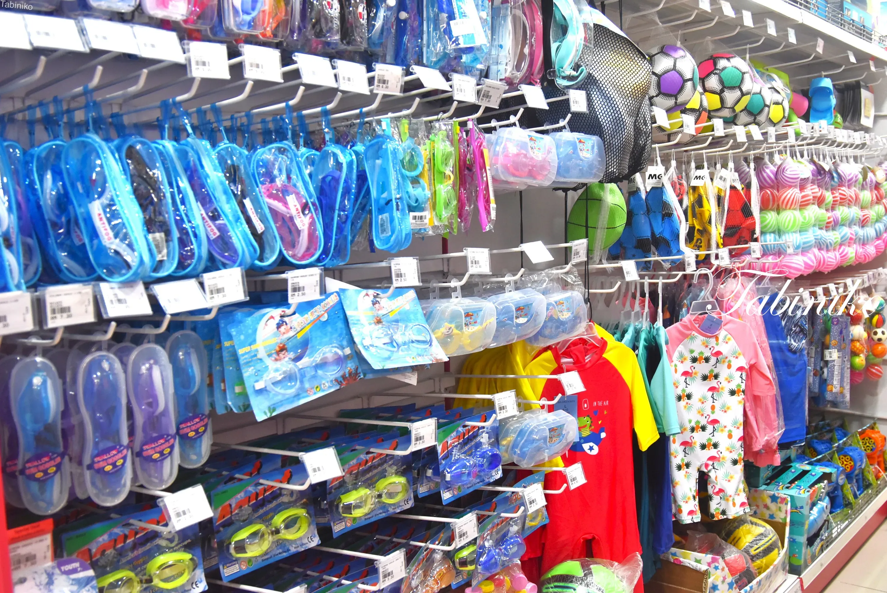 水中眼鏡、水着、水遊びの時に使うもの、ビート板とかも売ってます。