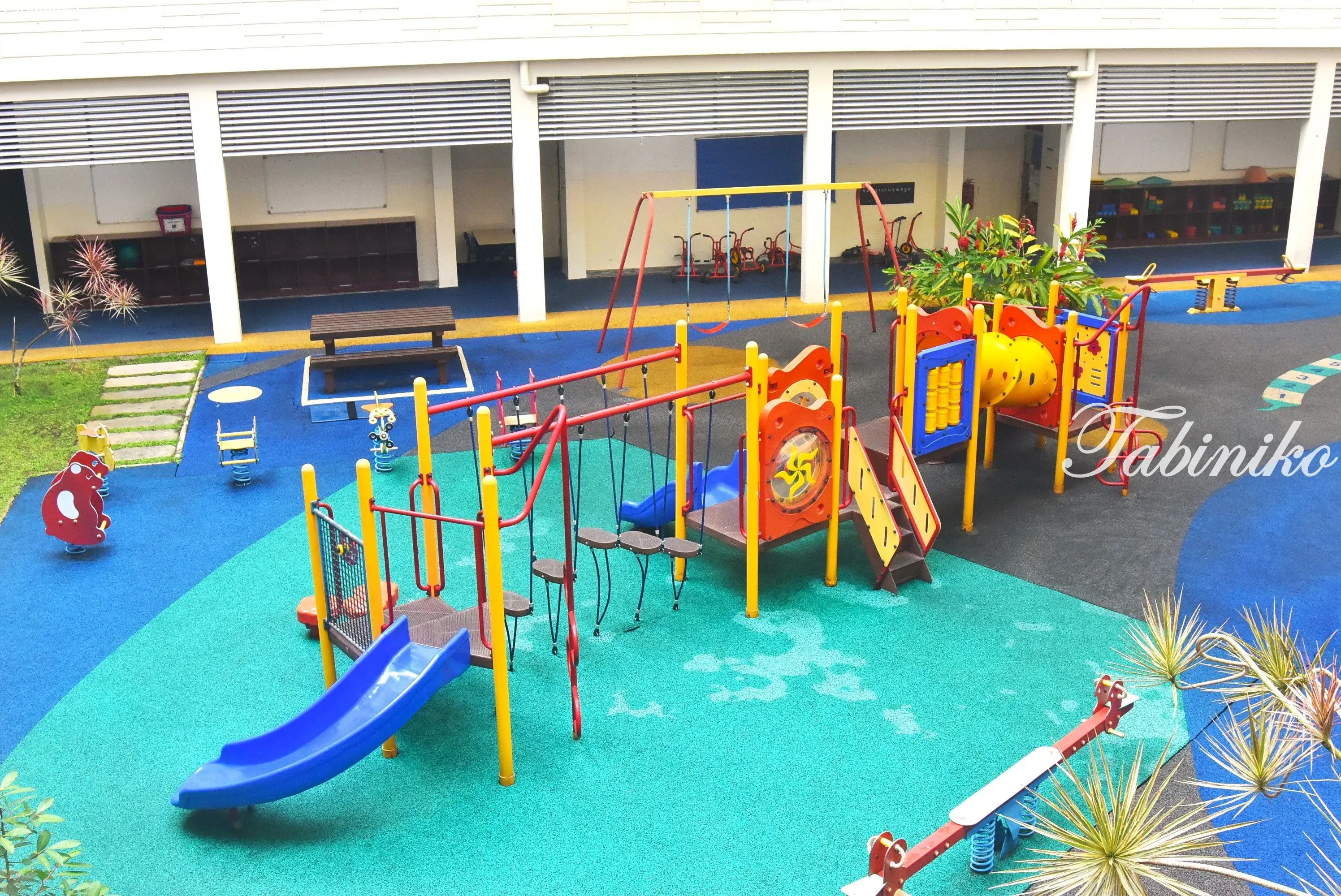 外のプレイグラウンドも広くて、体を動かしながら勉強出来るように、文字やマスなどが描かれています。地面はクッション性のあるゴムのようになっていて転んでも衝撃が少ない仕様です。