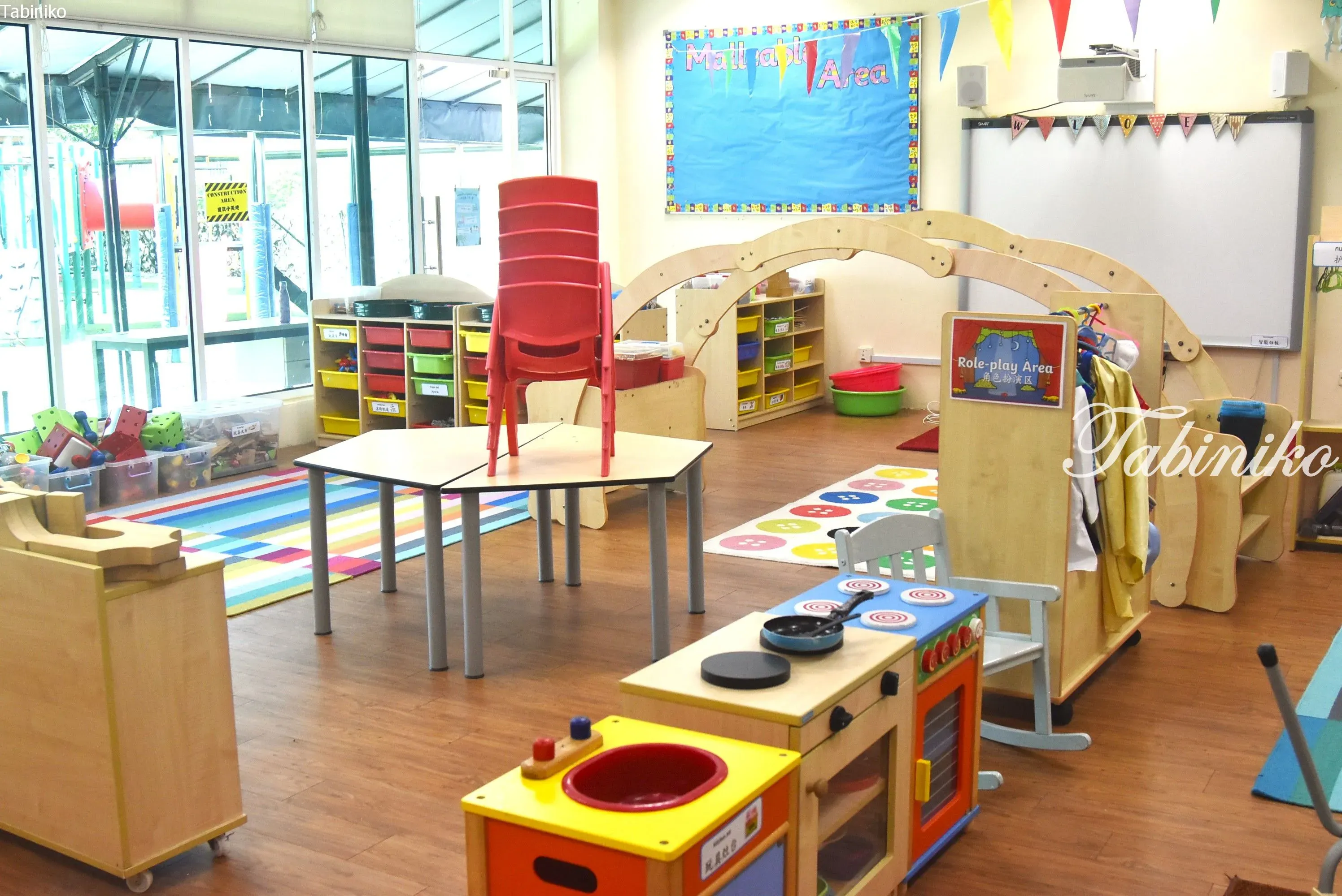 おままごとをするときに使う服かな??これもマレーシアの幼稚園で初めて見ました。 あと物の名前が英語と中国語で書かれたパネルが貼られていて、子供たちがわかりやすく自然に勉強出来る環境が整えられています。