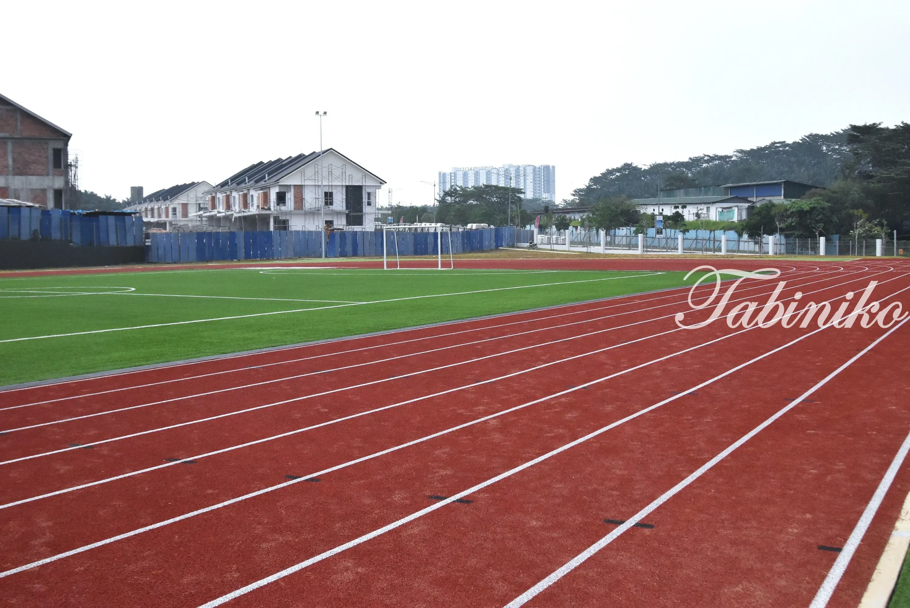 ゴムのクッション性があるエンジ色のトラックで、その周りの緑は人口芝です。アスファルトだと熱くなるので、この素材の方が熱くならないし、転んだ時の衝撃も少ないですね(´▽`)
