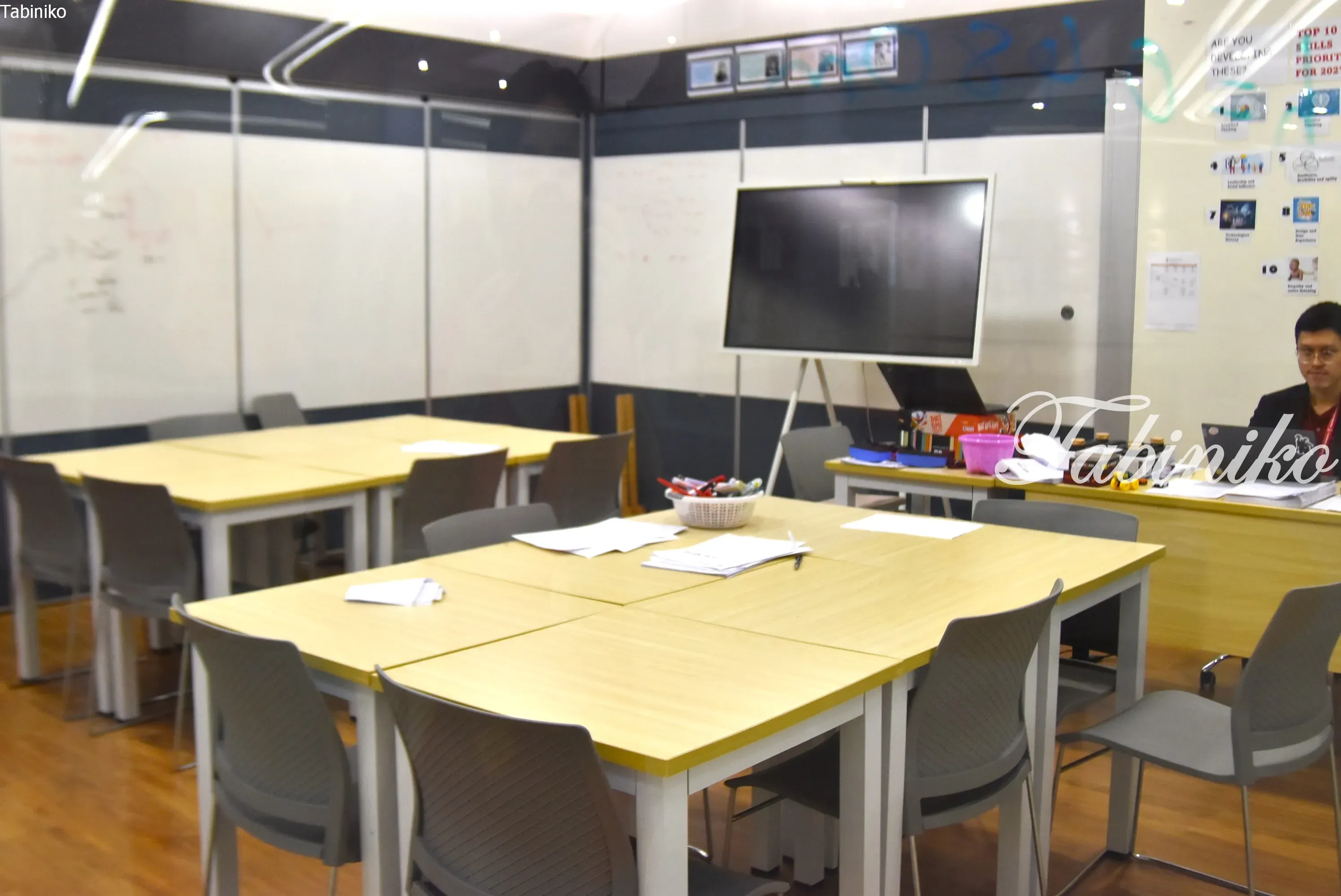 とても明るくて少人数制で、教室の雰囲気がとてもいいです。授業ではタッチパネル式のsmart TVを使います。