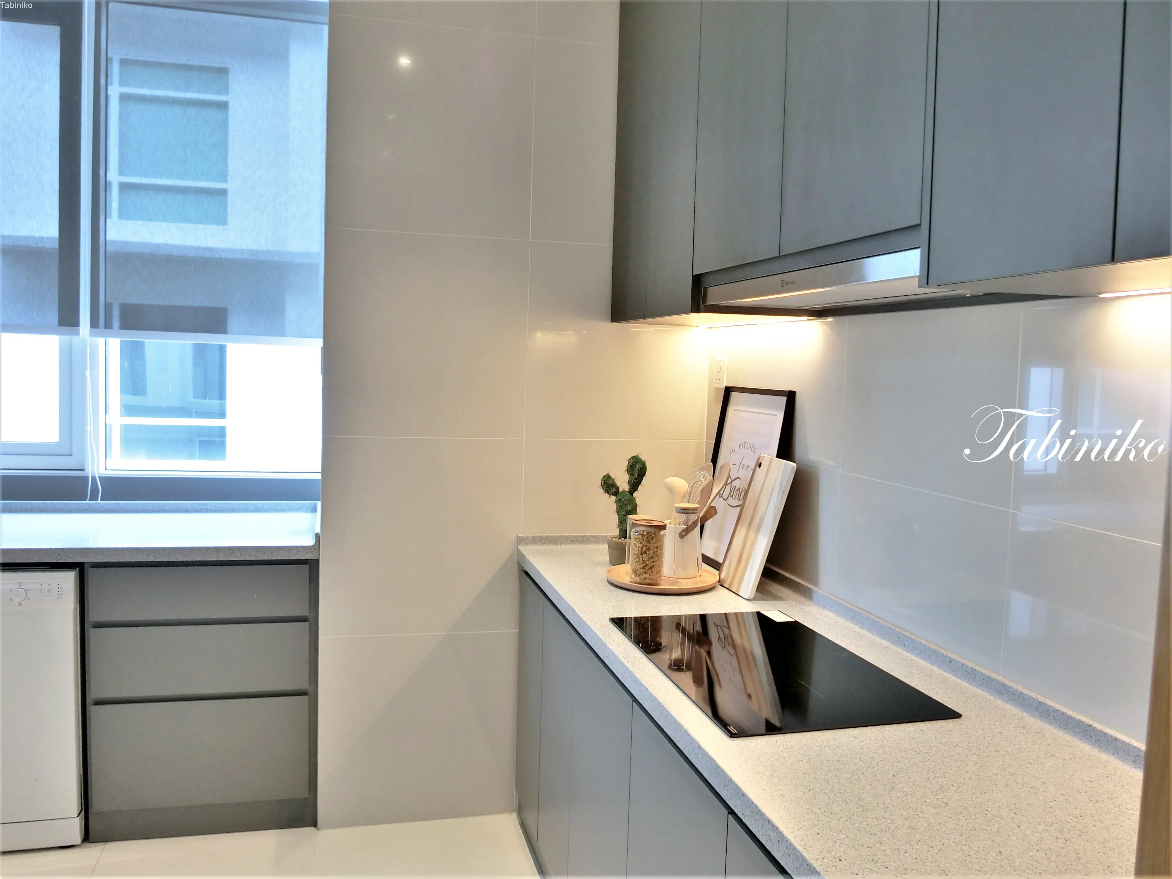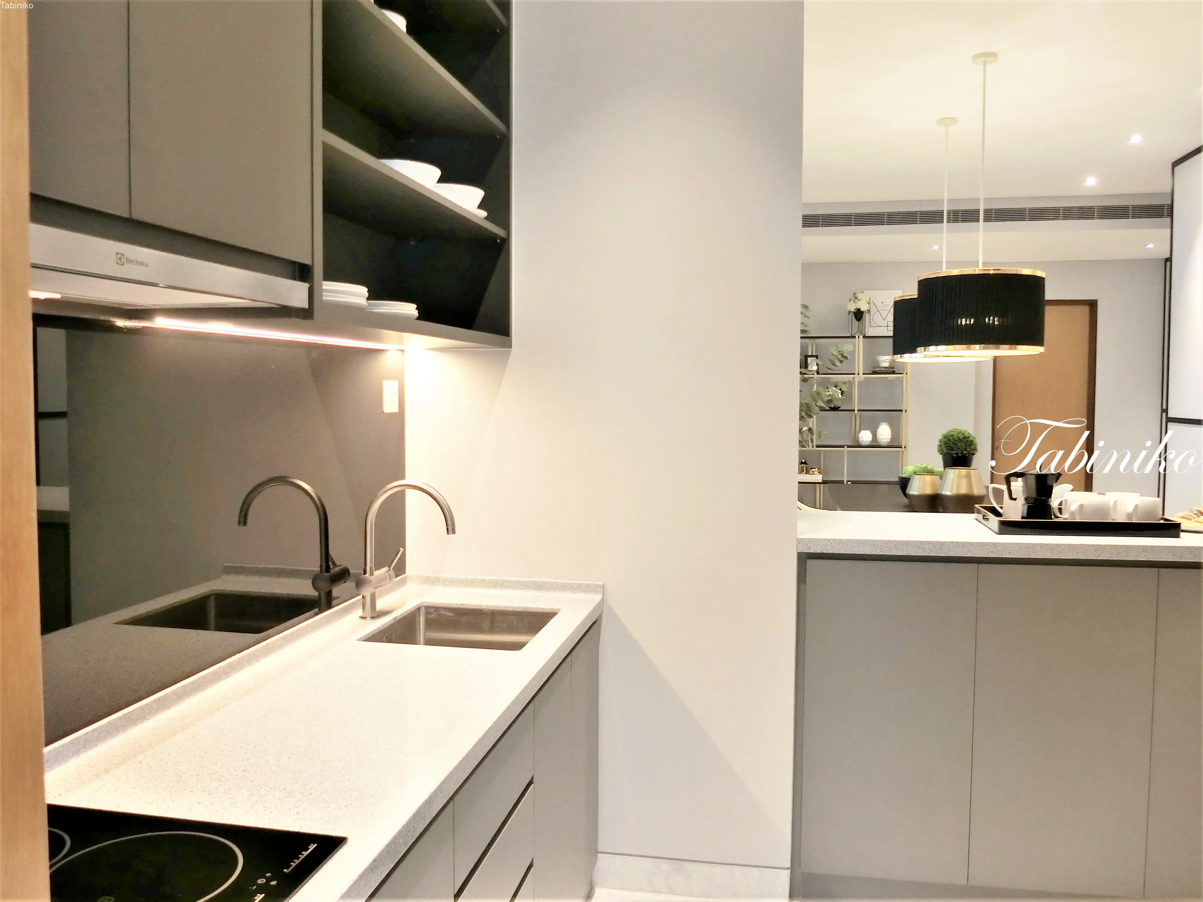 キッチンに戻ります。ダイニングルームから繋がるドライキッチン。キッチンキャビネット、IHコンロとシンクが装備。