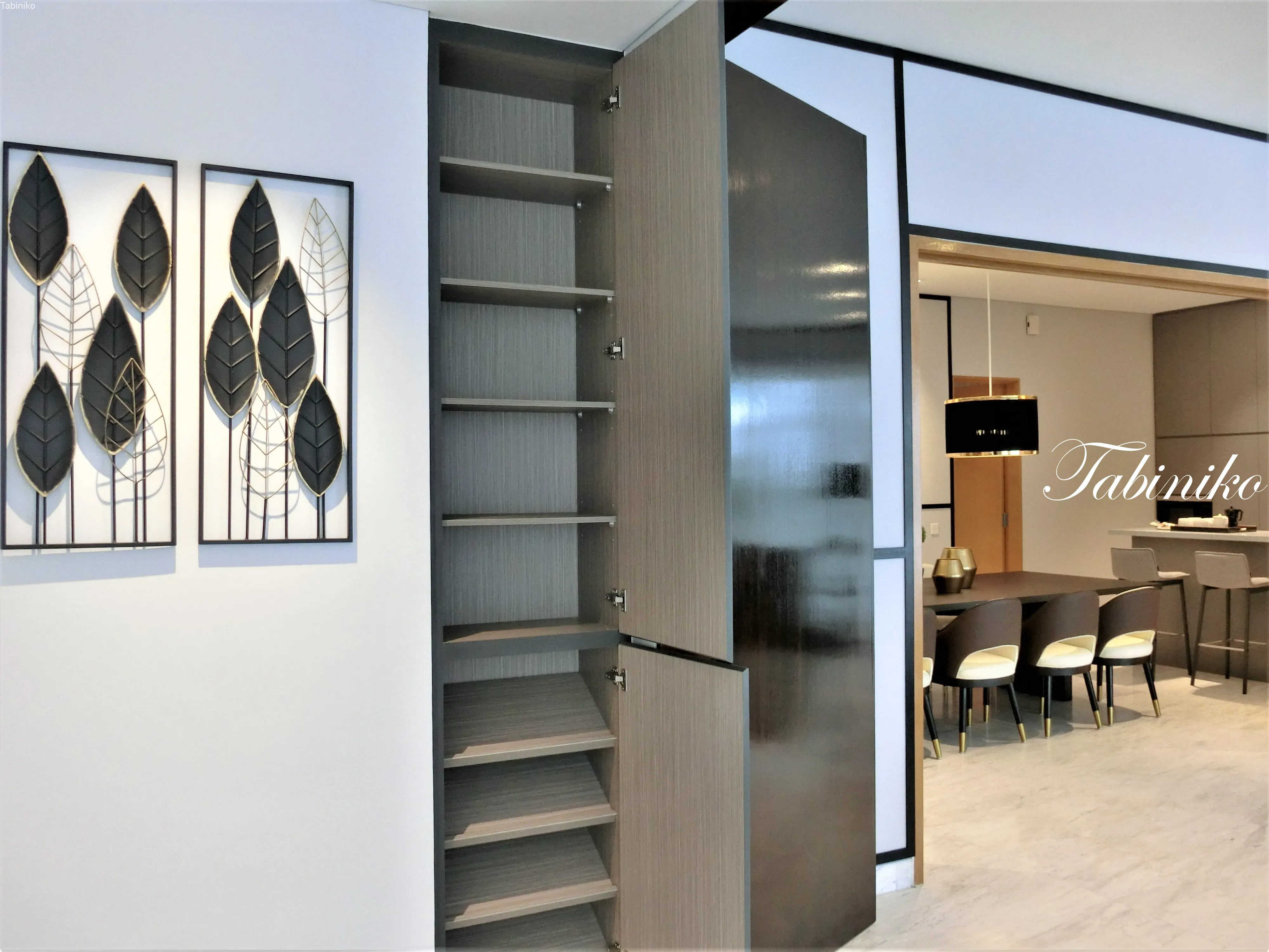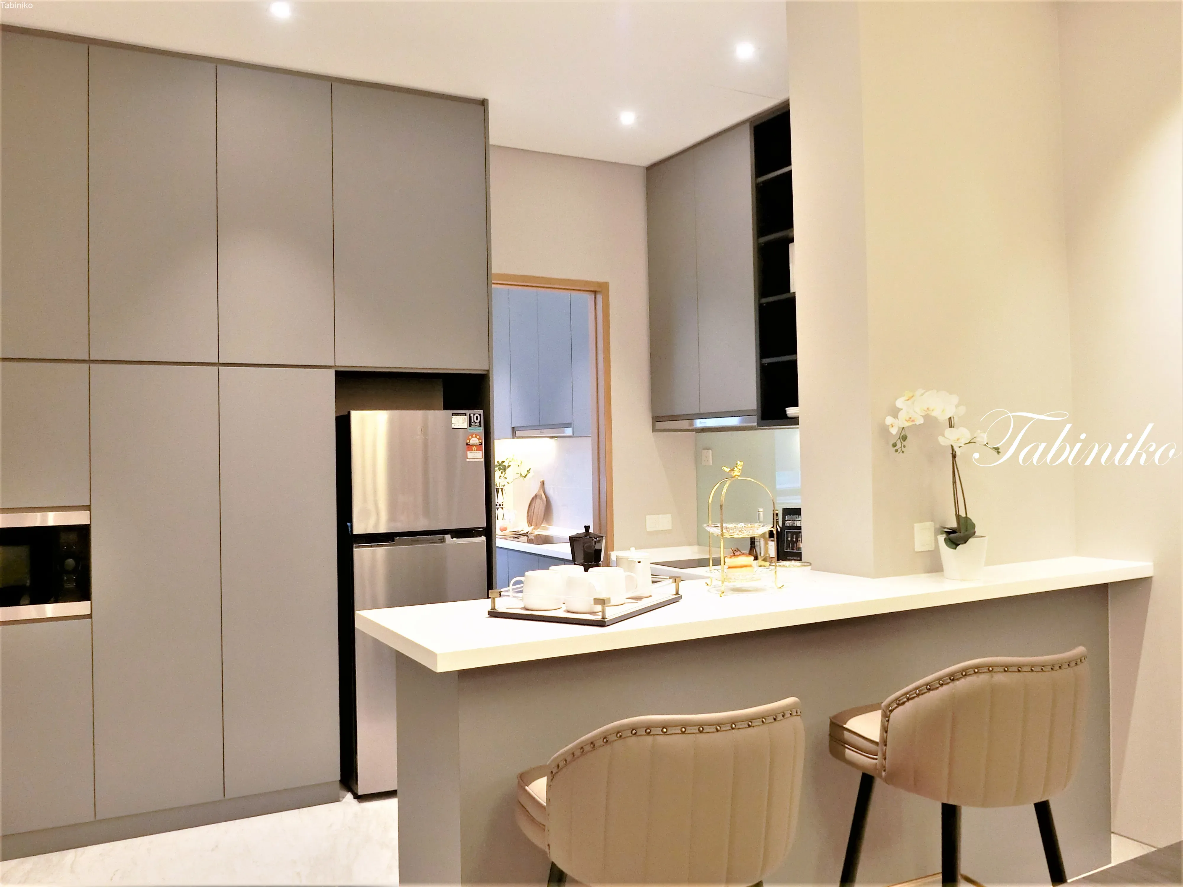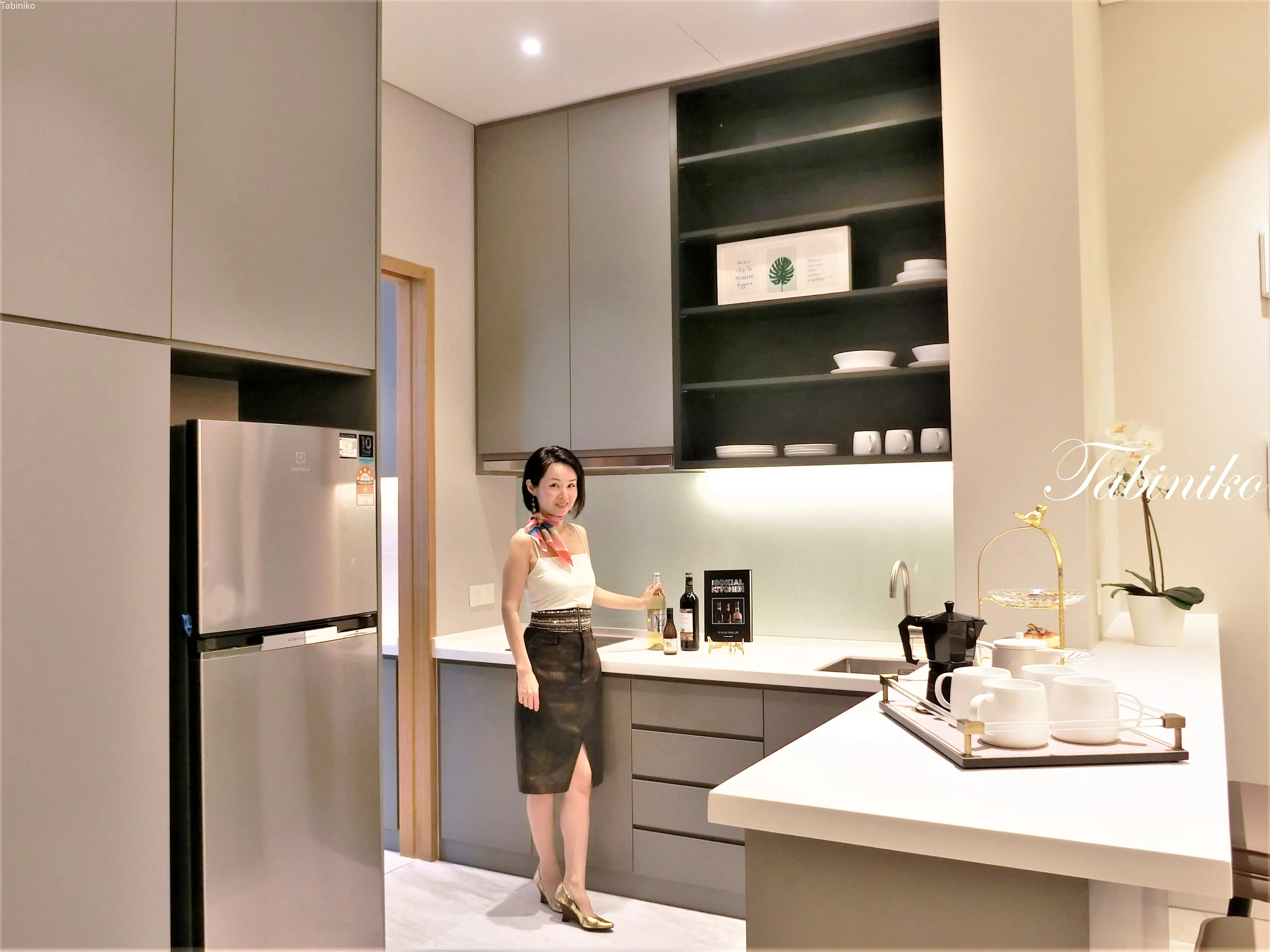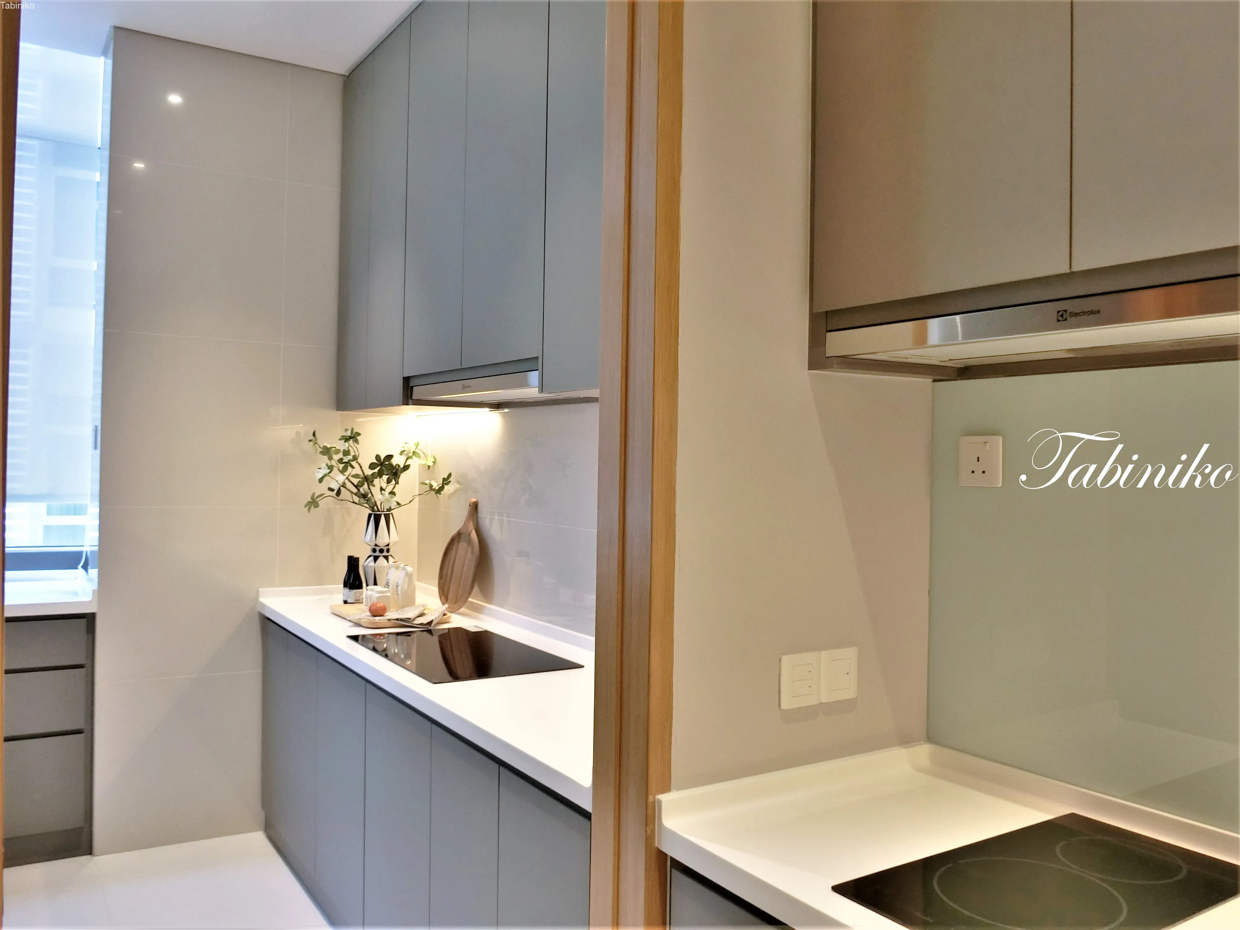 更に進むとウエットキッチンがあり、同じくキッチンキャビネット、IHコンロとシンクが装備で、キッチンが二個分という感じ!広くて本当に贅沢!