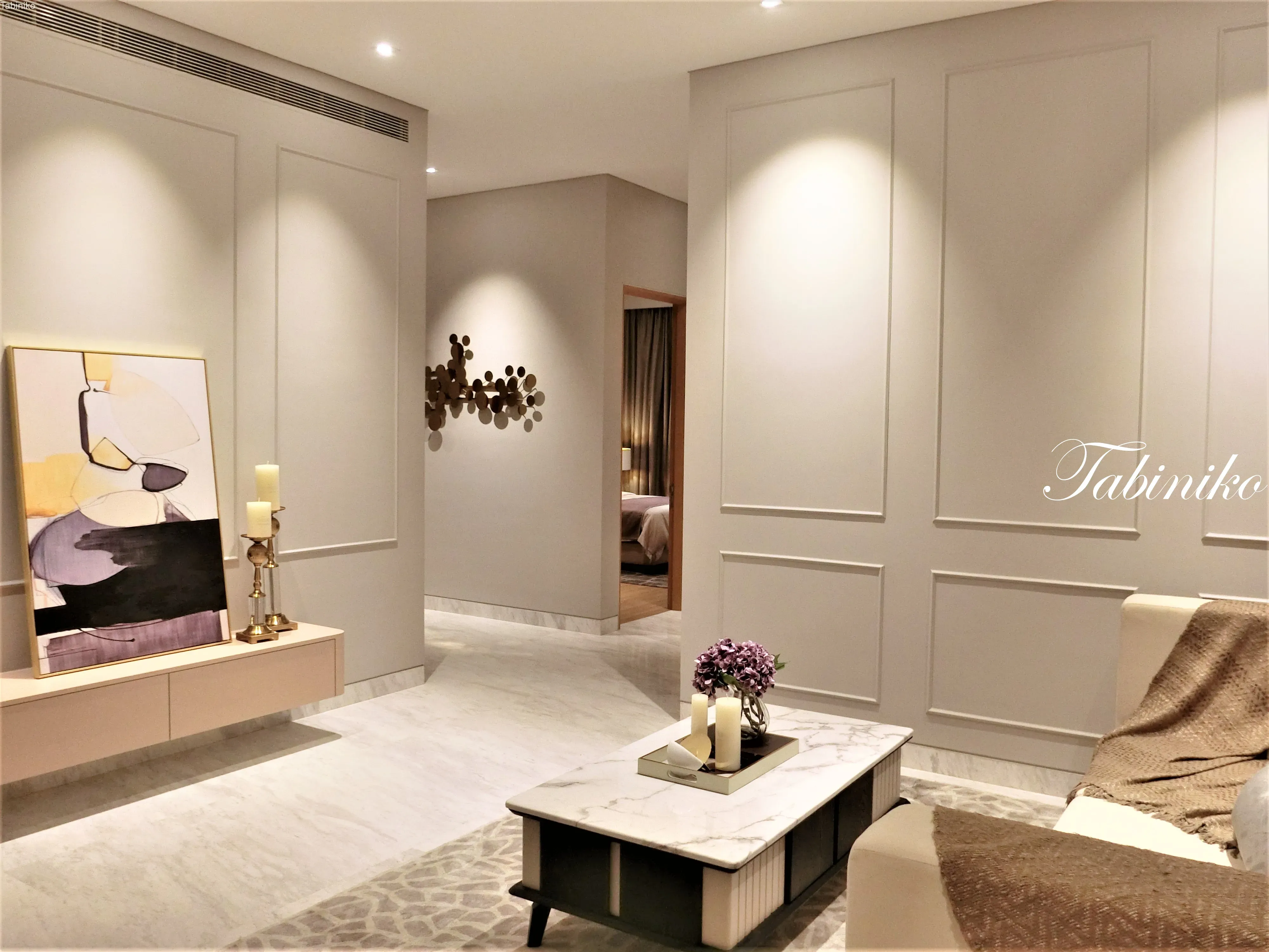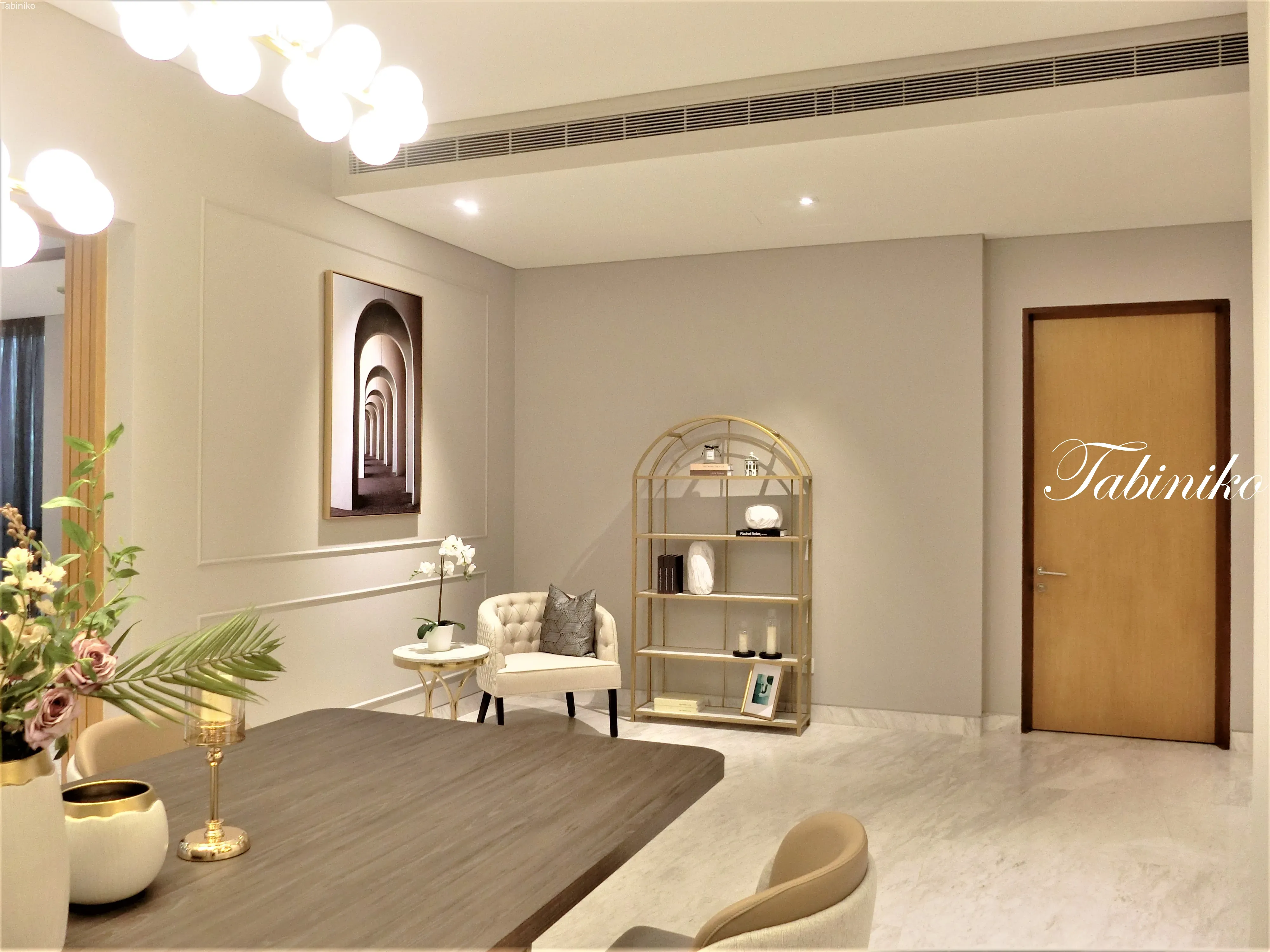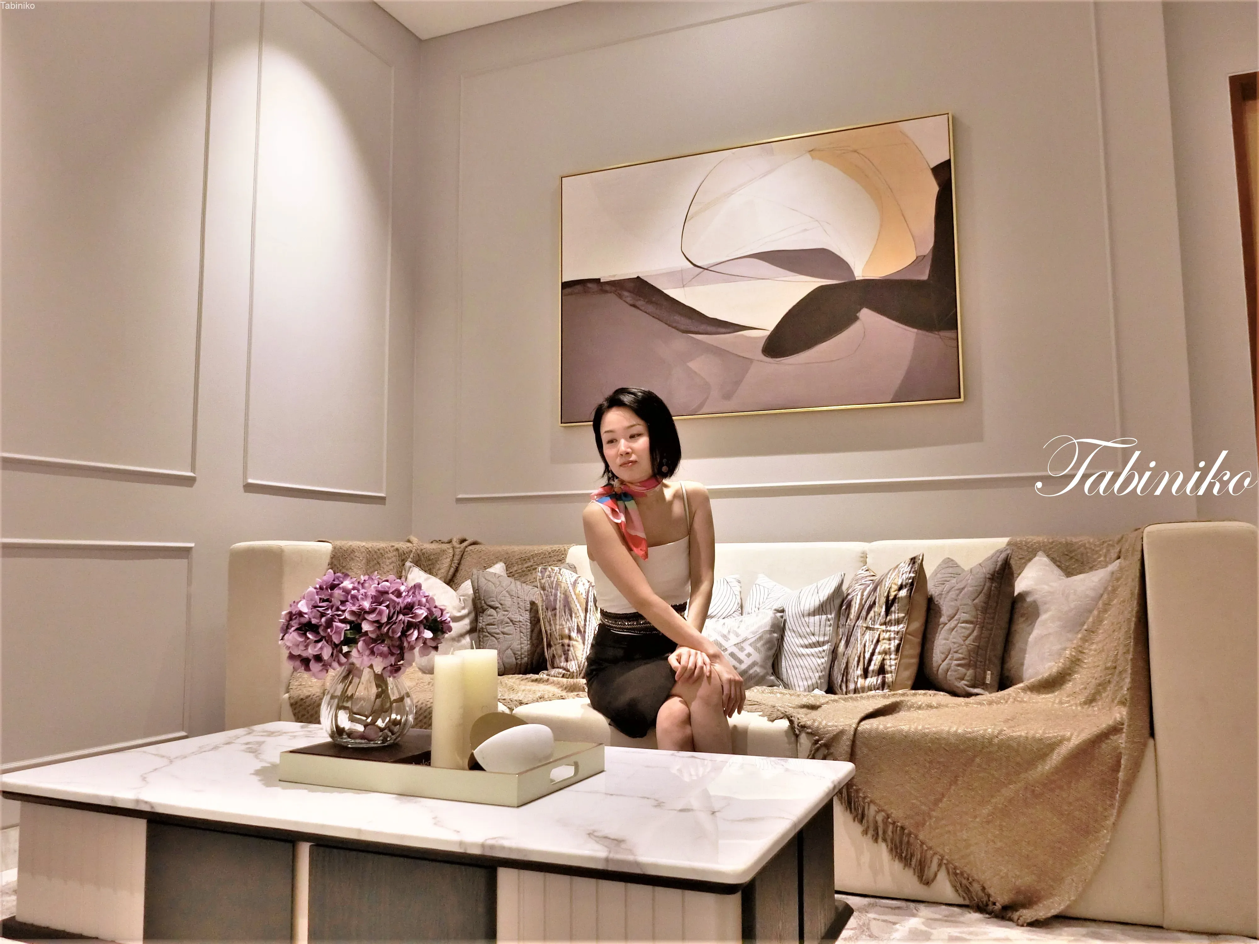 玄関を入って目に入るのは、オシャレなリビングルームです。大きいソファーとクッション、ライト、テーブル等全部あります。このユニットは家具付きです。