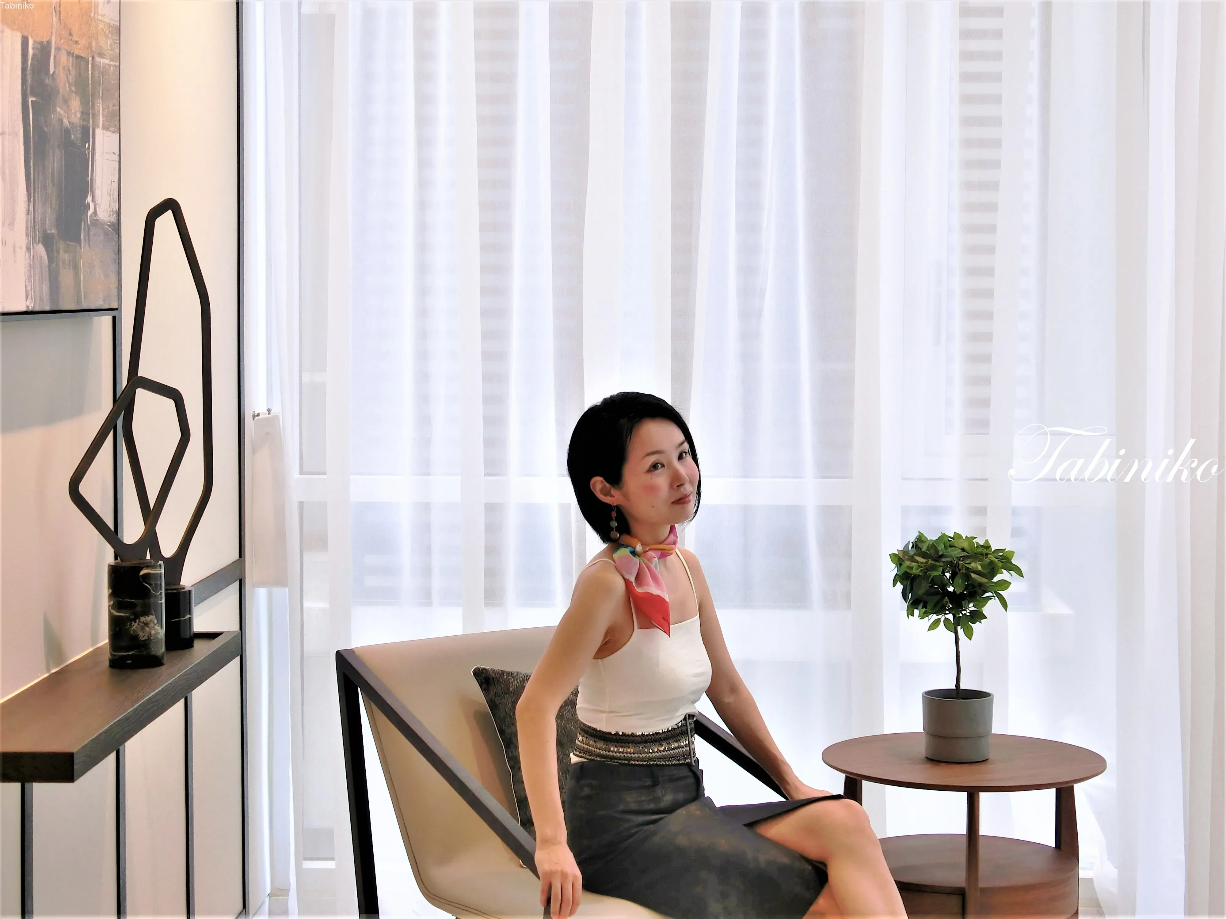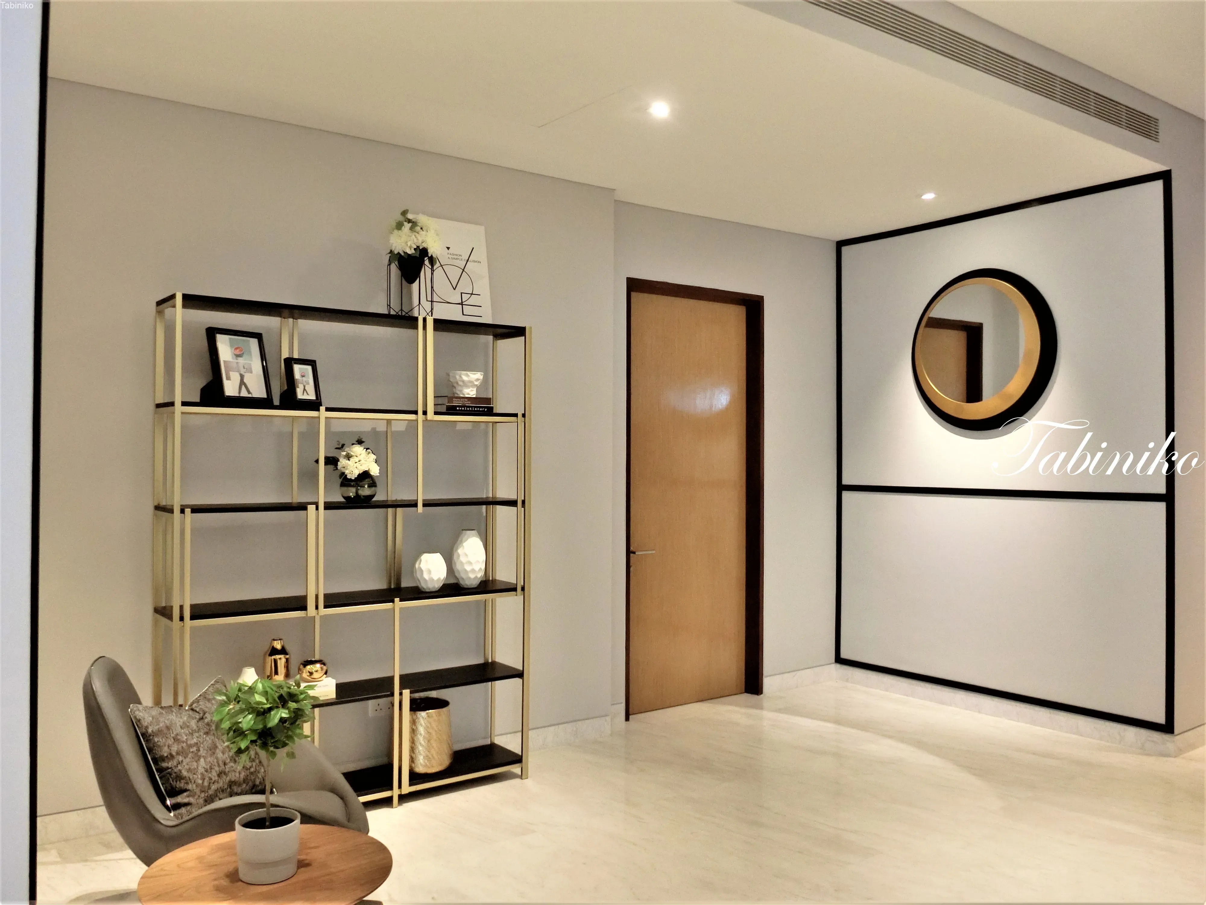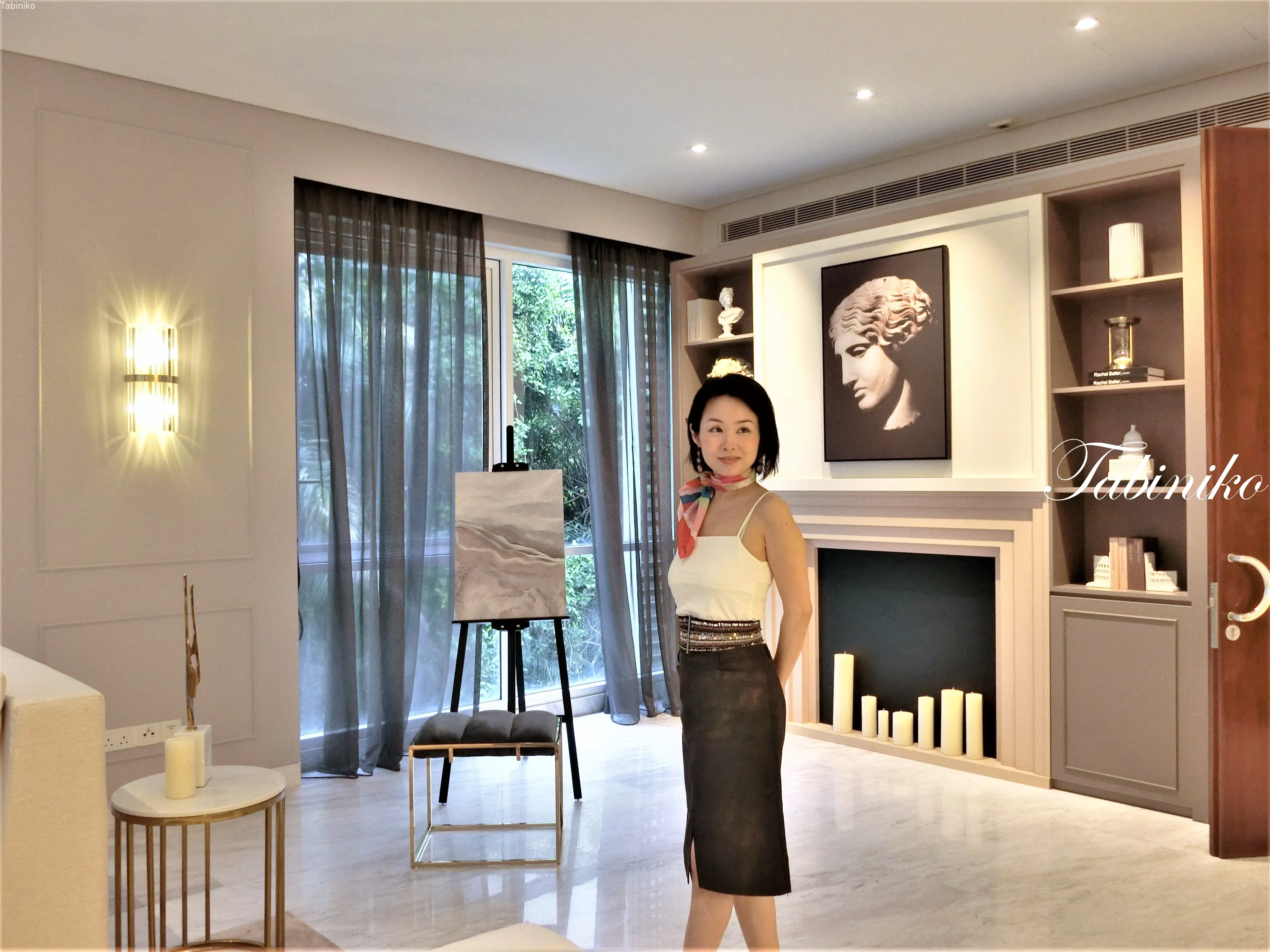 玄関を入って目に入るのは、オシャレなリビングルームです。大きいソファーとクッション、ライト、テーブル等全部あります。このユニットは家具付きです。
