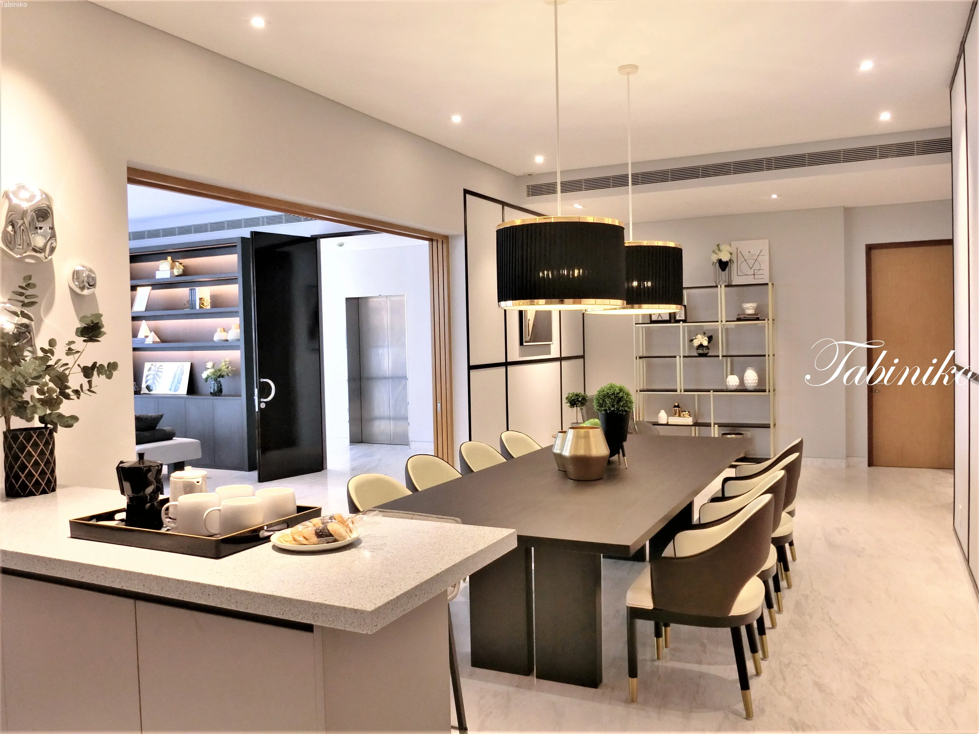 さ、ダイニングルームへ。8人がけのダイニングテーブルとライトが素敵。奥の台はカウンターキッチンです。
