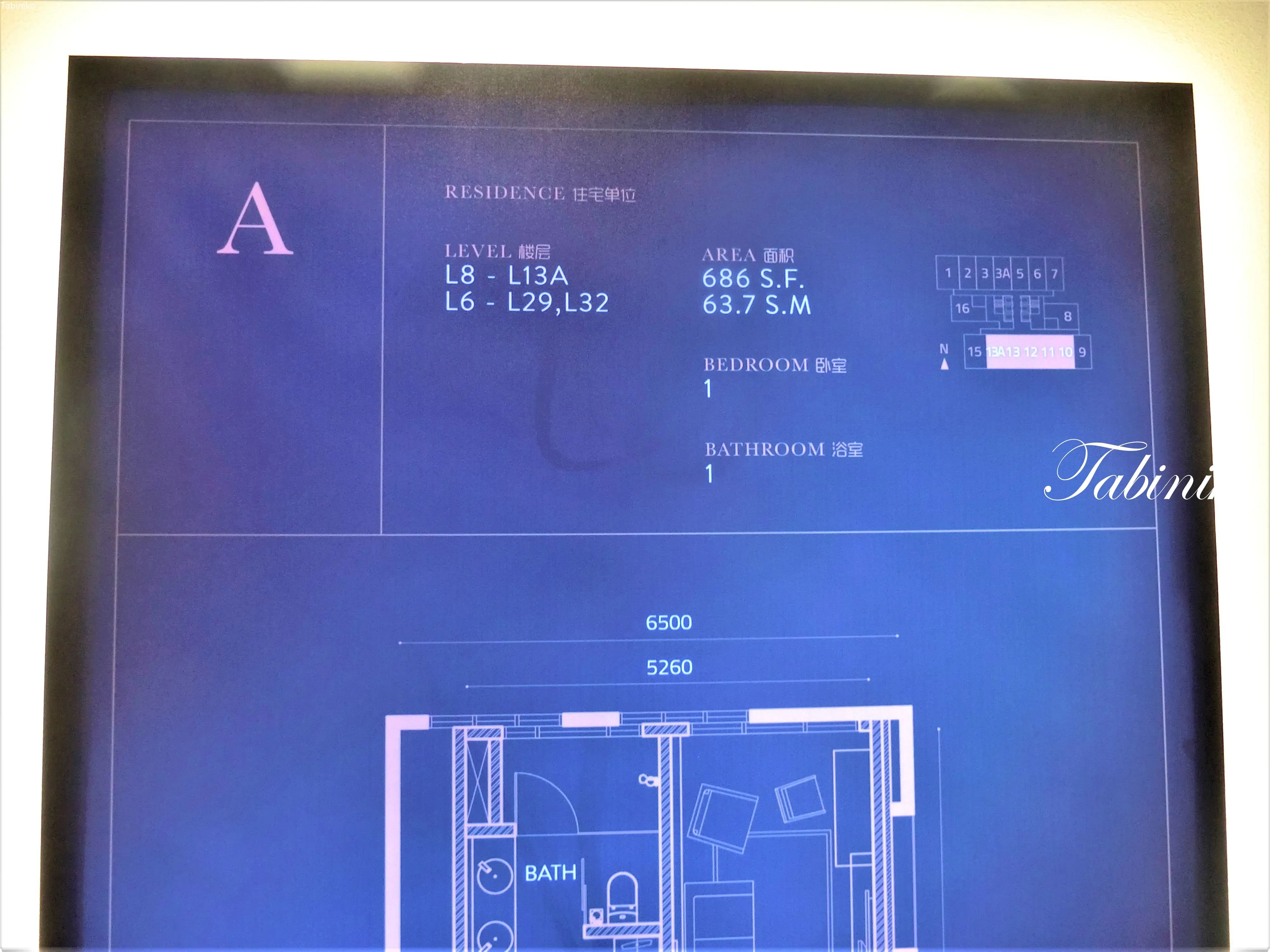このタイプはA2, 686sqft (2 bedroom, 2 bathroom)、約63㎡で、Dual Keyタイプです。詳しく説明すると、ドアを開けると二つのユニットに分かれて、別々に生活にできるタイプの部屋です。上の写真は、その一つの部屋です。キッチン、棚のエリア、トイレ、ベッドルーム。