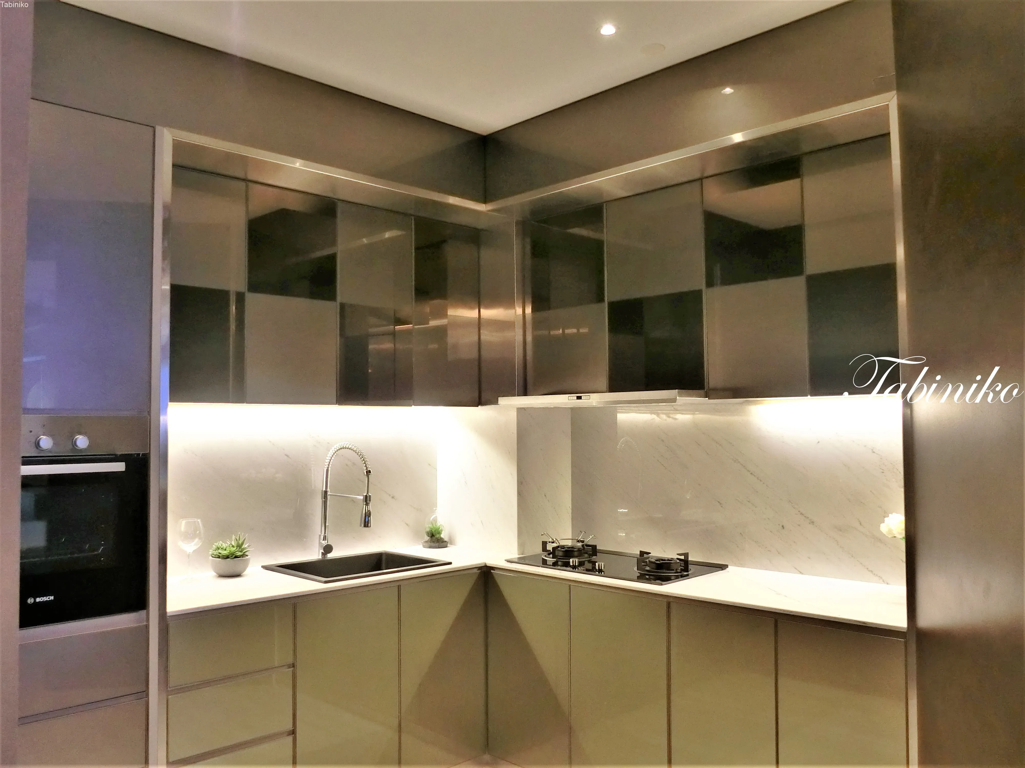 部屋に入ると、まずキッチン。キッチンキャビネットとシンクが装備されていてスッキリとした作り。マレーシアはよくContemporary、現代的なデザインと言いますね。蛇口もオシャレ。