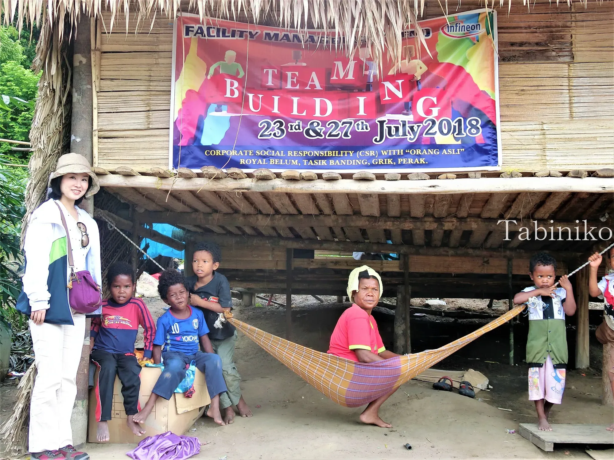 ホテルから船で30分くらいの所にあるオランアスリ村で、何とかの葉で作った屋根のオランアスリの家が沢山あります! この村に上陸して見学させて頂きました。