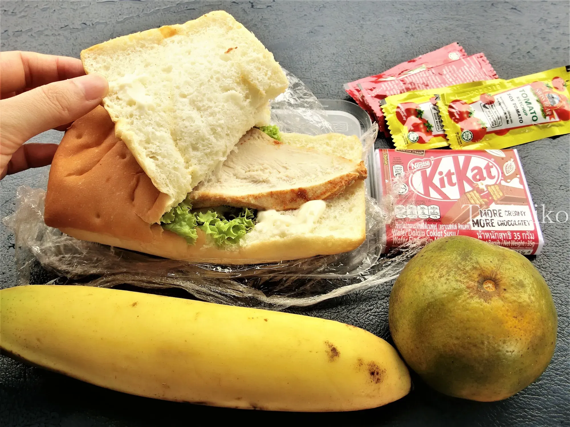 ランチはチキンサンドイッチとバナナとみかんとキットカット。