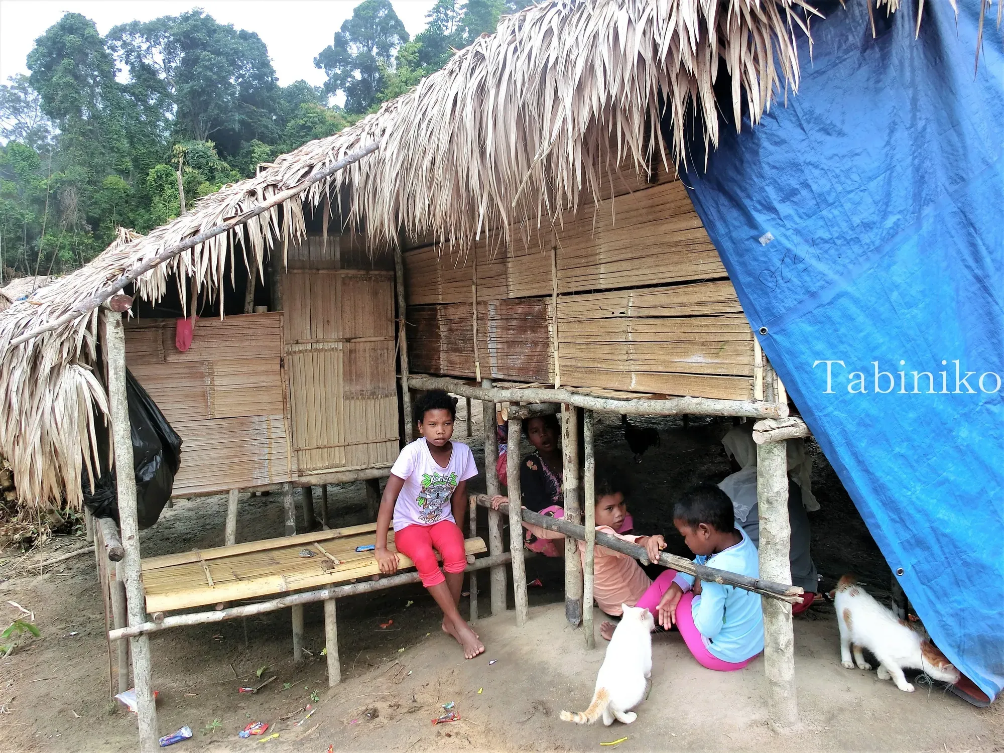 ここに住んでる原住民は、昔々アフリカから来た移民で、ずっとここに住んでいるんだそうです。 この村には森の木や葉、竹を材料にした家や、バトミントンコート?のようなもの、猫や鶏などもいました。勿論トイレはないので、用を足すときは木の陰に隠れて(笑)