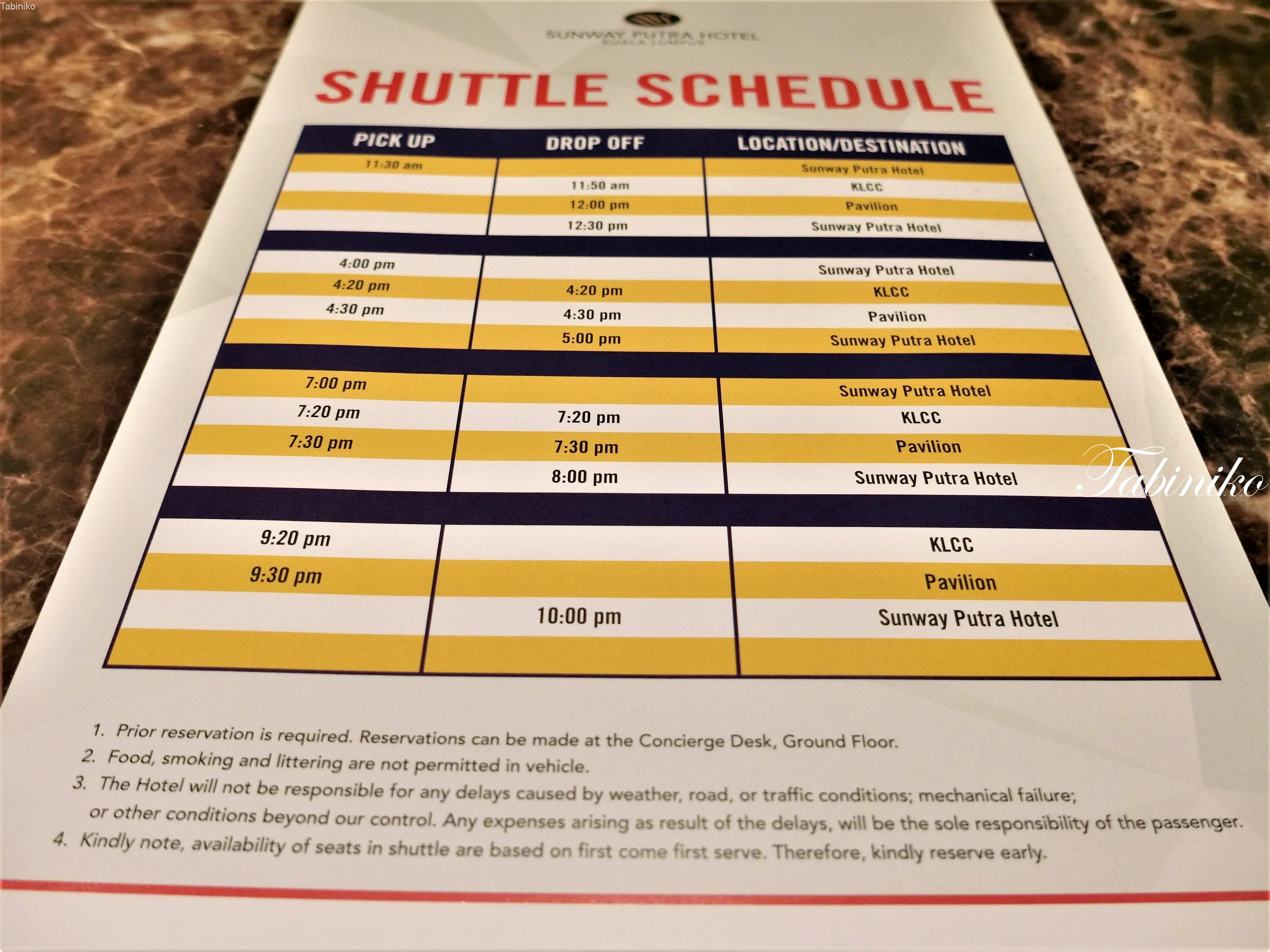 1日4回、Sunway Putra Hotel Kuala Lumpur → KLCC → Pavilion → Sunway Putra Hotel Kuala Lumpurを巡回しているシャトルバスがあります。シャトルバスは事前に予約が必要になりますので、直接コンシェルジュにて予約して下さい。