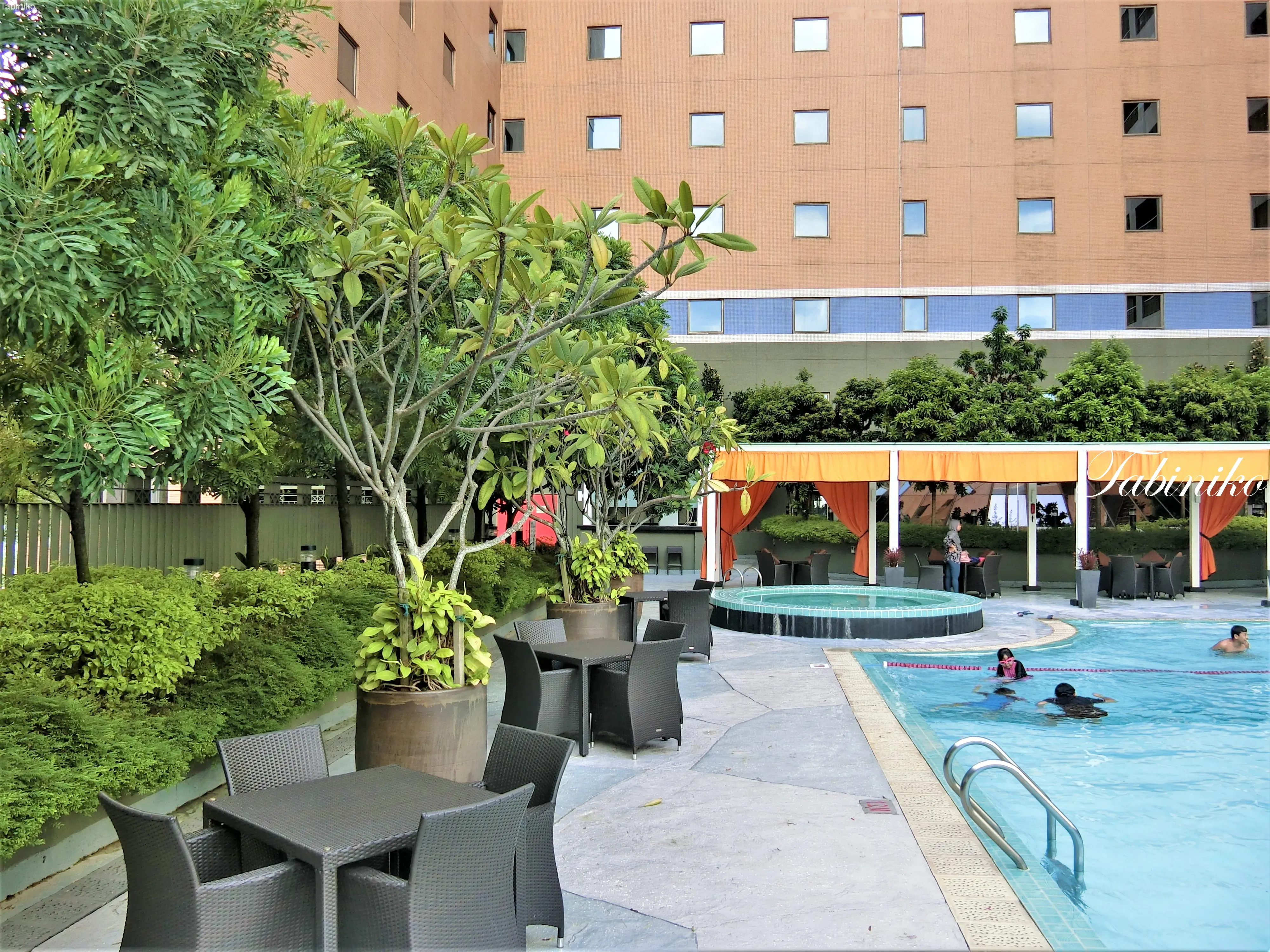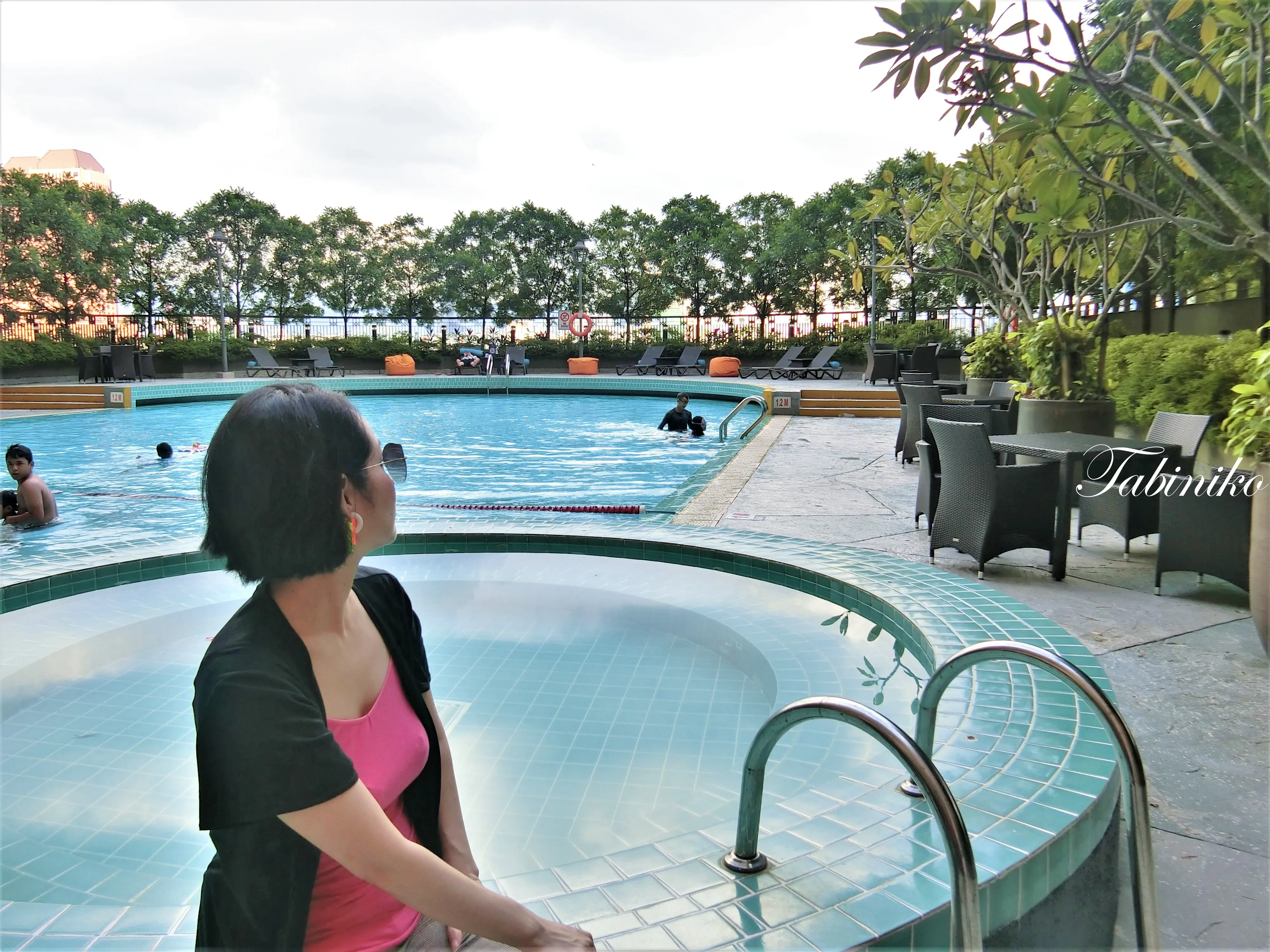 グリーンに囲まれて、ホテルのプールでのんびり出来ますよ。真ん中に大きなプール。その周りの4プールサイドにはベンチがあり、休憩できます。手前の丸いプールはジャグジーです。子供を連れてプールサイドでお散歩しました(^^♪