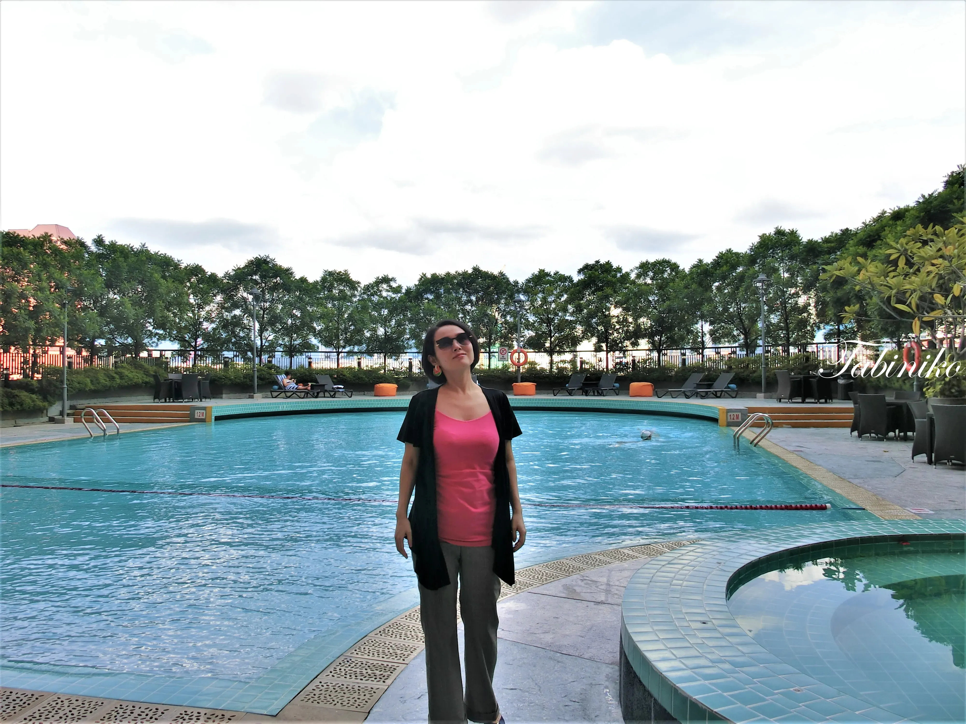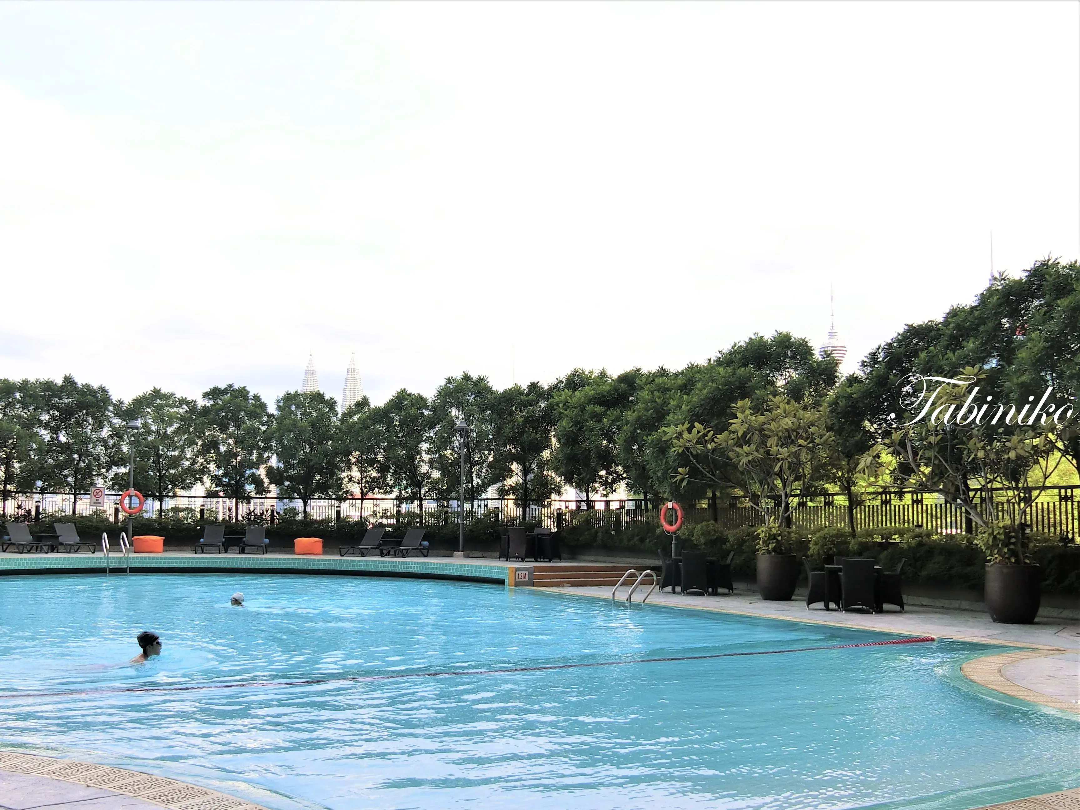 プールの周りは木が植えられていますが、向こう側にはツインタワーとKLタワーが見えます。広い空の下、大きなプールで気持ちいいですね(≧◇≦)