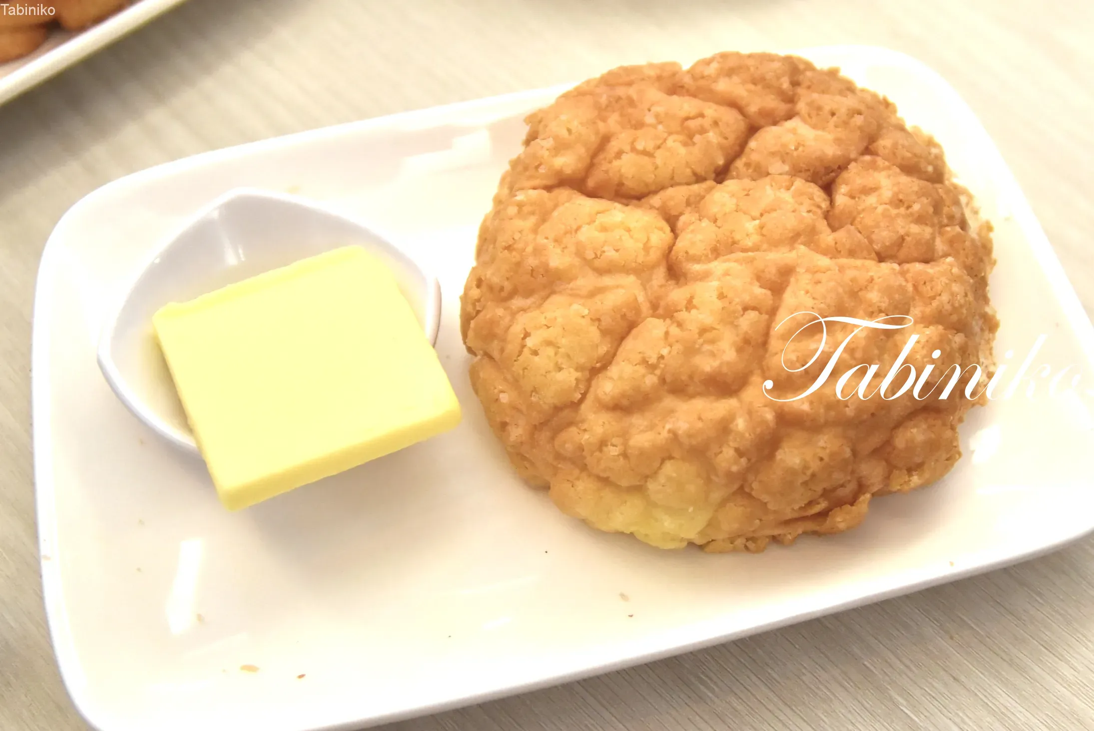 味はメロンパンと同じで、確かに少しメロンパンより固かった気がします!(マレーシアに移住してきて7年経つので、7年以上メロンパンを食べてないので忘れかけていますが💦💦)たっぷりバターを挟んで食べてね。