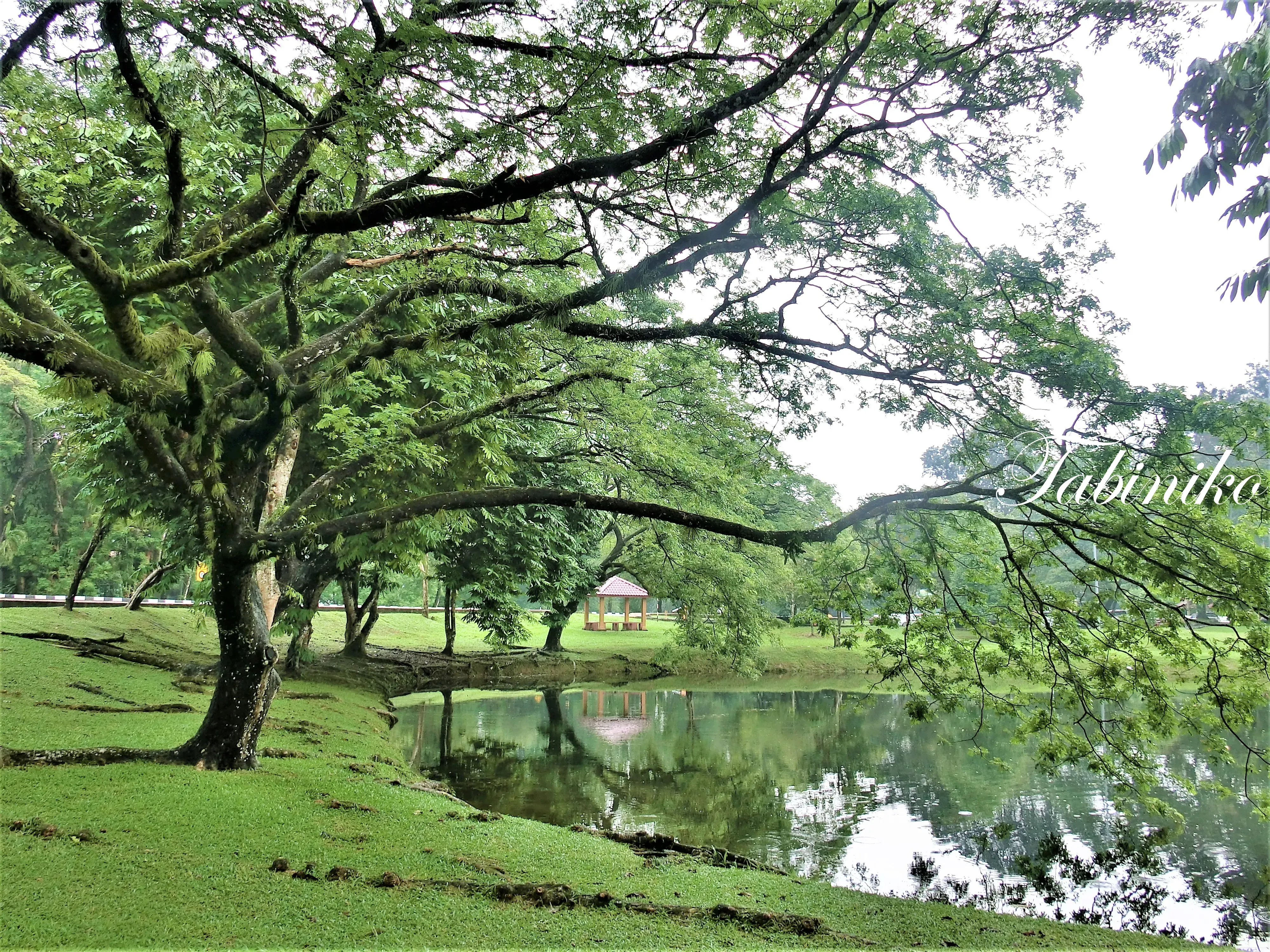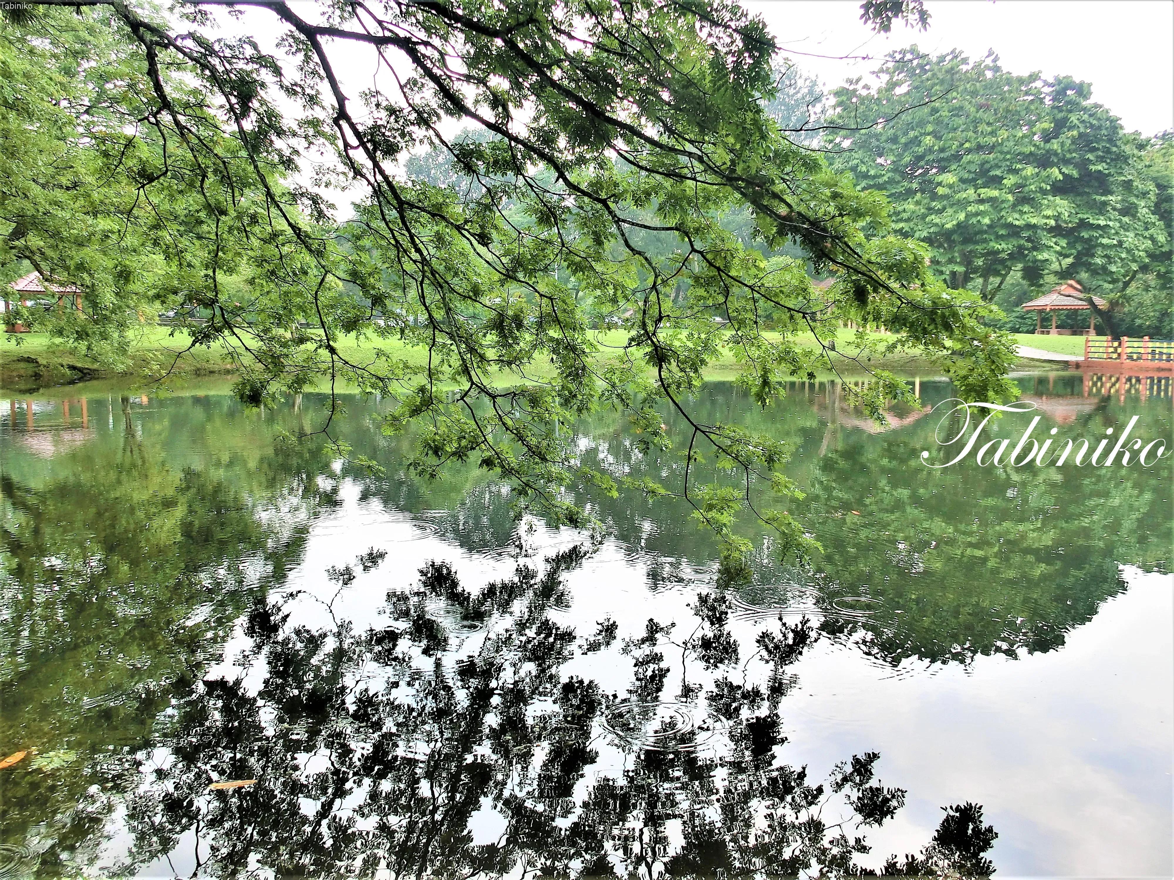 湖のほとりに立つ Rain Tree(レインツリー) は、枝が遊歩道を横切るほど大きく伸び、さらに湖の上へと広がっています。