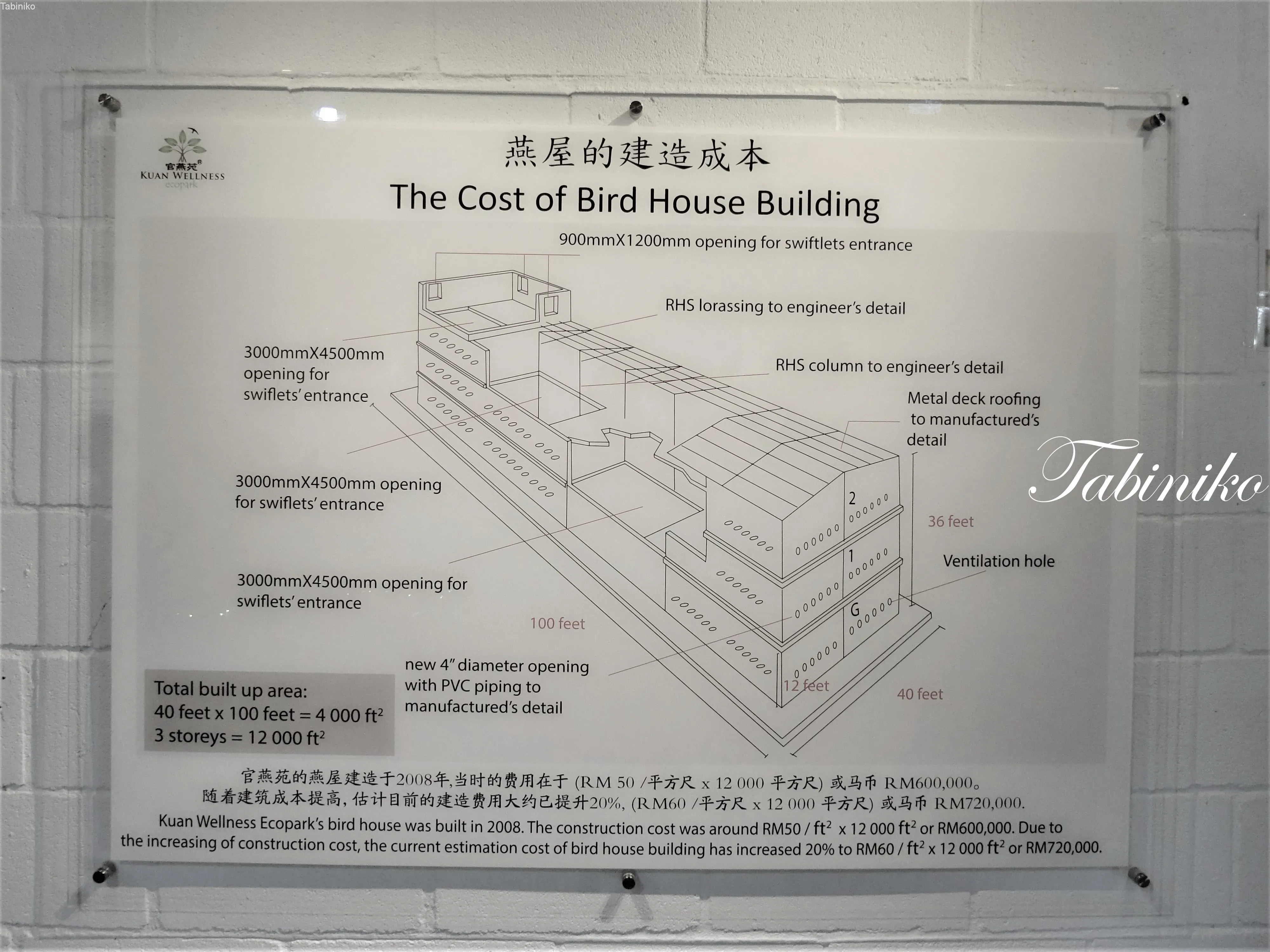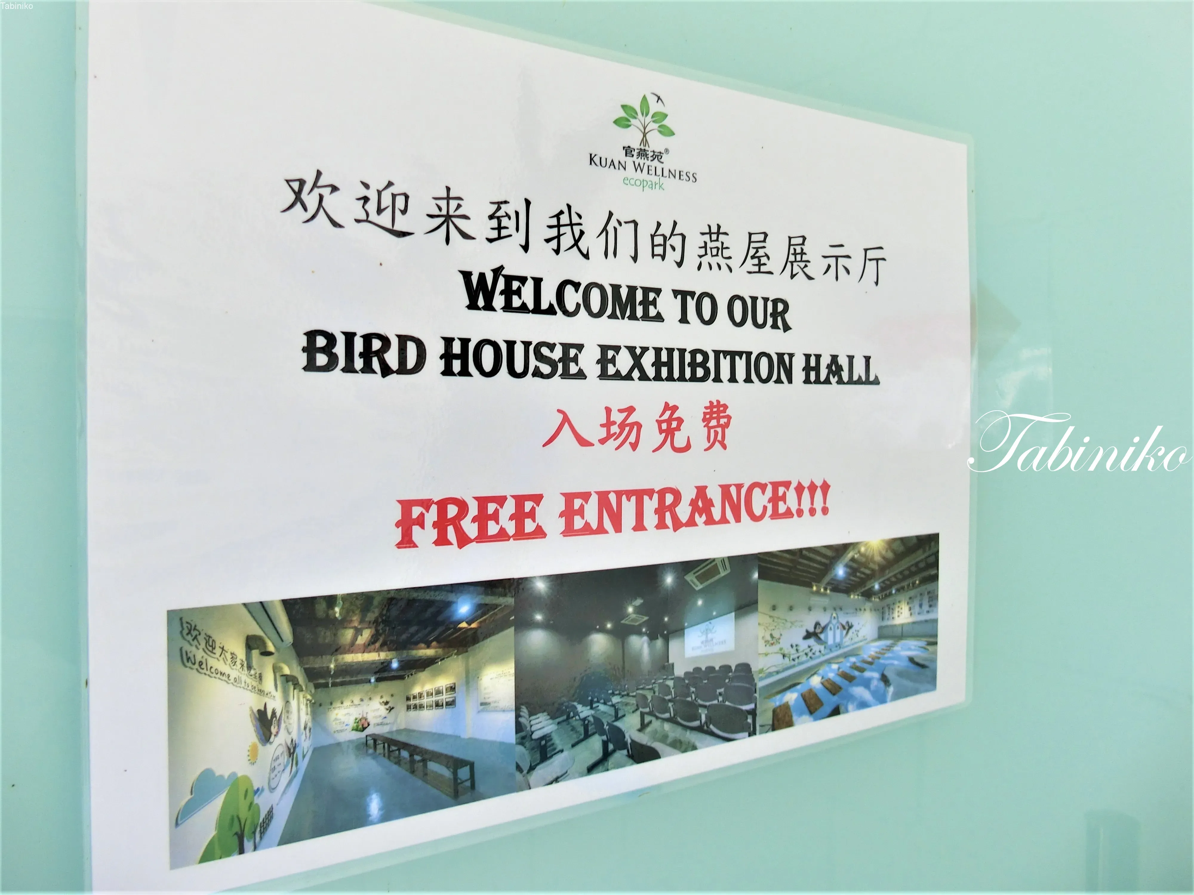 入り口から色々資料が展示されています。官燕苑 (Kuan Wellness Eco Park)の建物はこうやって建てられた等、ビデオでツバメをどうやって採取するのかを説明したり、種類等の知識も教えてくれたりしますので、なかなか面白かったです。(英語、中国語のみ)。ツバメのオブジェと写真も撮って、面白い体験でした。日本にはこのようなツバメの博物館はもちろんなく、マレーシアではツバメの飼養に投資している人もいて、ビジネスとして飼養しています。中国とかに輸出しているそうです。