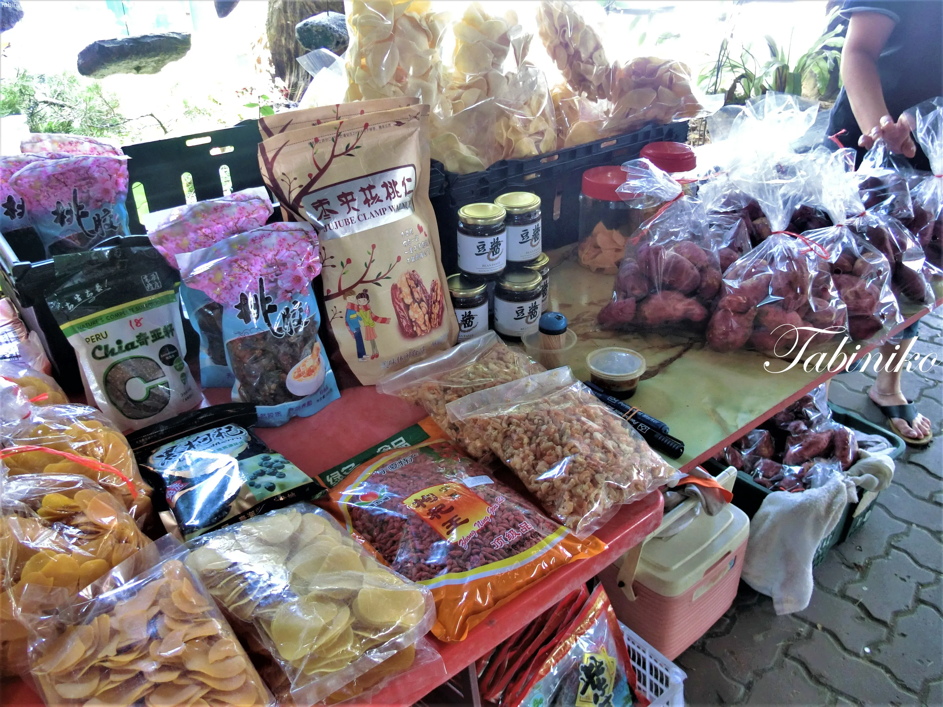 第4カ所目は、1520pmに到着しました。片栗粉の工場?どんな感じなの??まず、本体がイモっぽいことにちょっと驚きです。工場の工程を見学しました。作業員がまずその本体の皮を剥いて洗浄して、多分その後はスライスかな、そしてベーキング。見学といっても一目で見渡せるスペースで、説明員もいませんでした。ま、入場料も無料だし、自由に出入りできます。片栗粉で出来ているお菓子の販売店は、色々なお菓子や現地の特産品等のお土産で一杯です。そして、超美味しい!