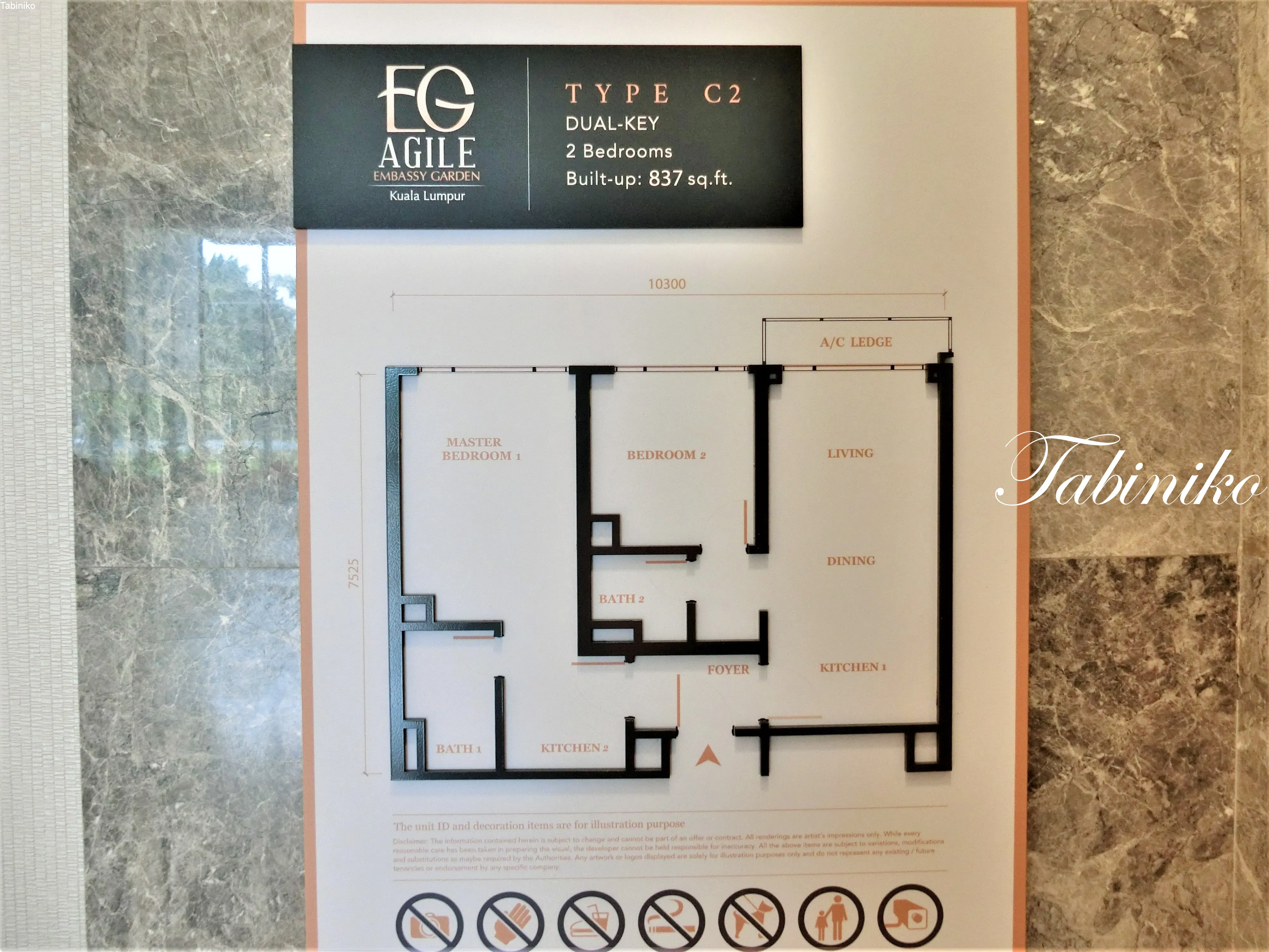 Type C2の2ベッドルーム —- 837 sqft(約77.7㎡)