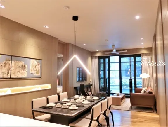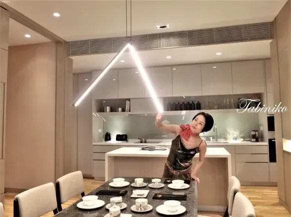 キッチン、ダイニングルーム、リビングルーム、ベランダと一体化になっていて、動線が一直線、シンプルでスマート。キッチンは、キャビネット+シンク+オーブン+電子レンジ+冷蔵庫が付いています。キャビネットは天井まであり、収納スペースは広いです。