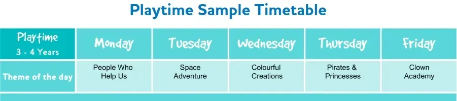Playtimeプログラムは、3~4歳のお子さまに創造的なアート、サイエンス、体育、そして情緒的な健康を促進する楽しく魅力的なアクティビティを提供します。学齢前のお子さまたちが成功した学生になるための第一歩をサポートします。Playtimeは午前9時から12時30分までの半日プログラムです。
