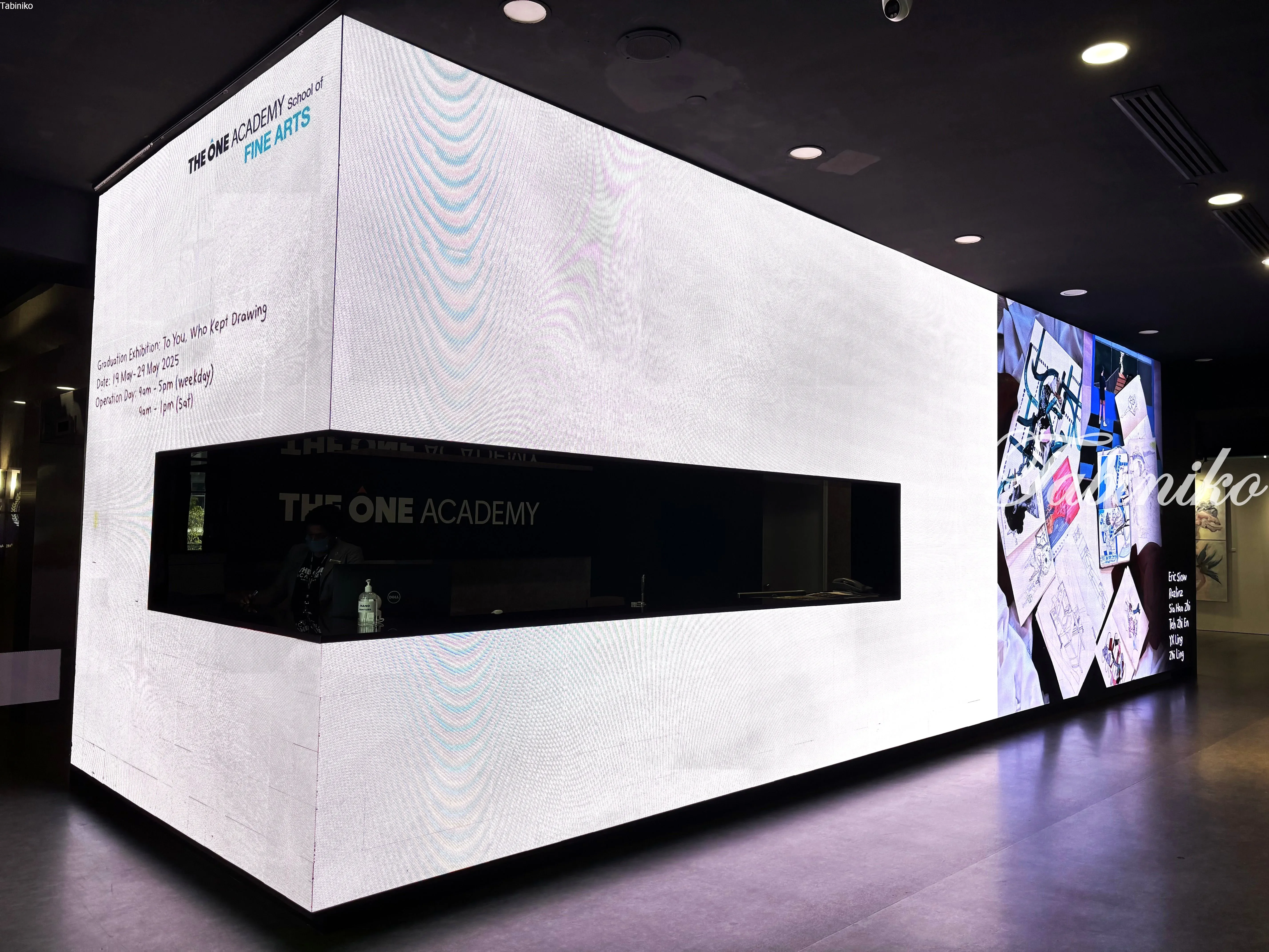 さすが美術系の学校だけあって、受付から違います!!写真だとわかりにくいですが、白い部分がカウンターになっていて中に受付の人がいます。白い部分と絵の部分はデジタルの壁になっていて、色んな映像が映し出される仕組みです。
