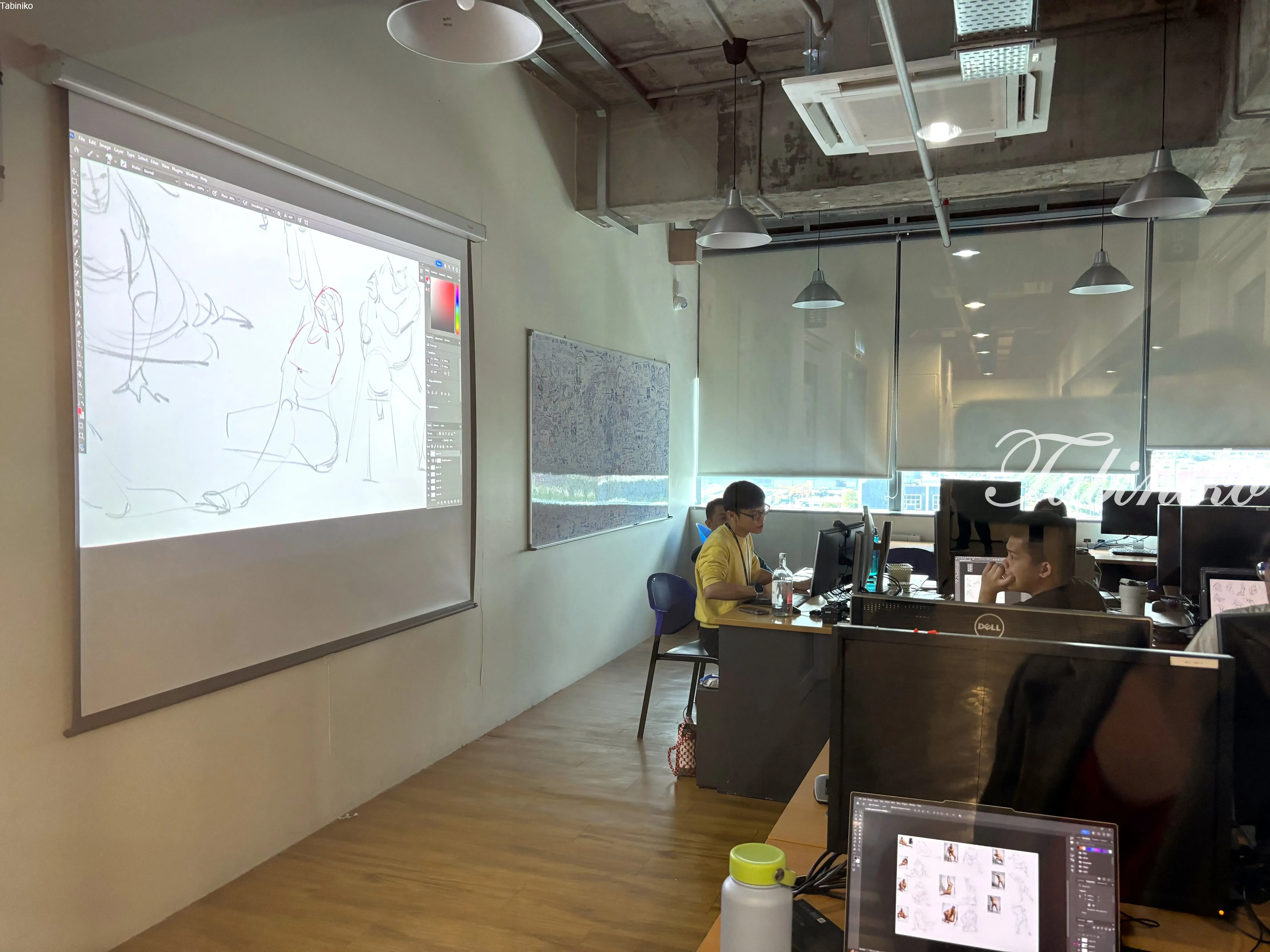 3Dモデリング(コンピュータ上で立体的な形状を作成する技術)で、映画やゲームのイラストを作成する勉強です。素晴らしい作品が廊下にたくさん飾ってありました。