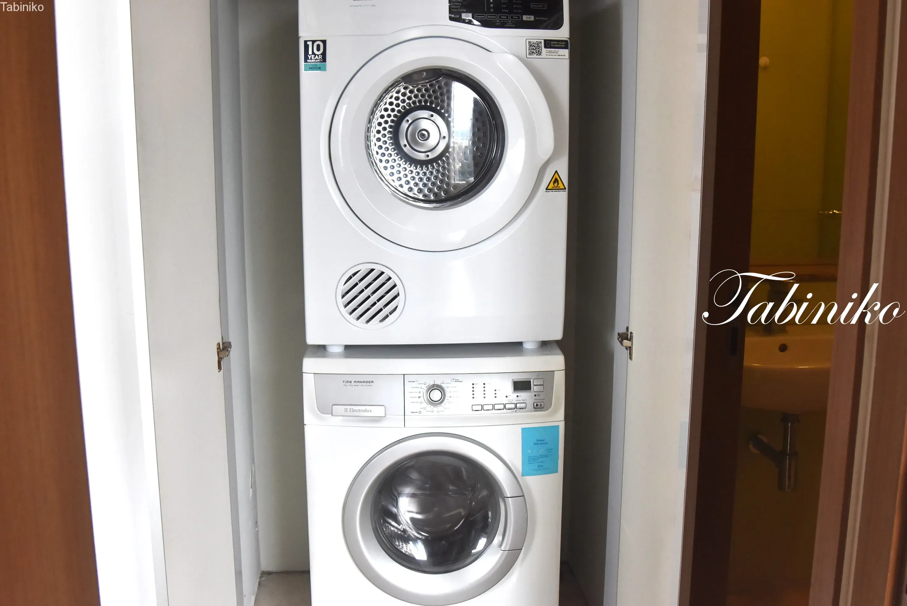 洗濯機と乾燥機もあります。棚の中に収納できるので、普段は見えないのでいいですね。