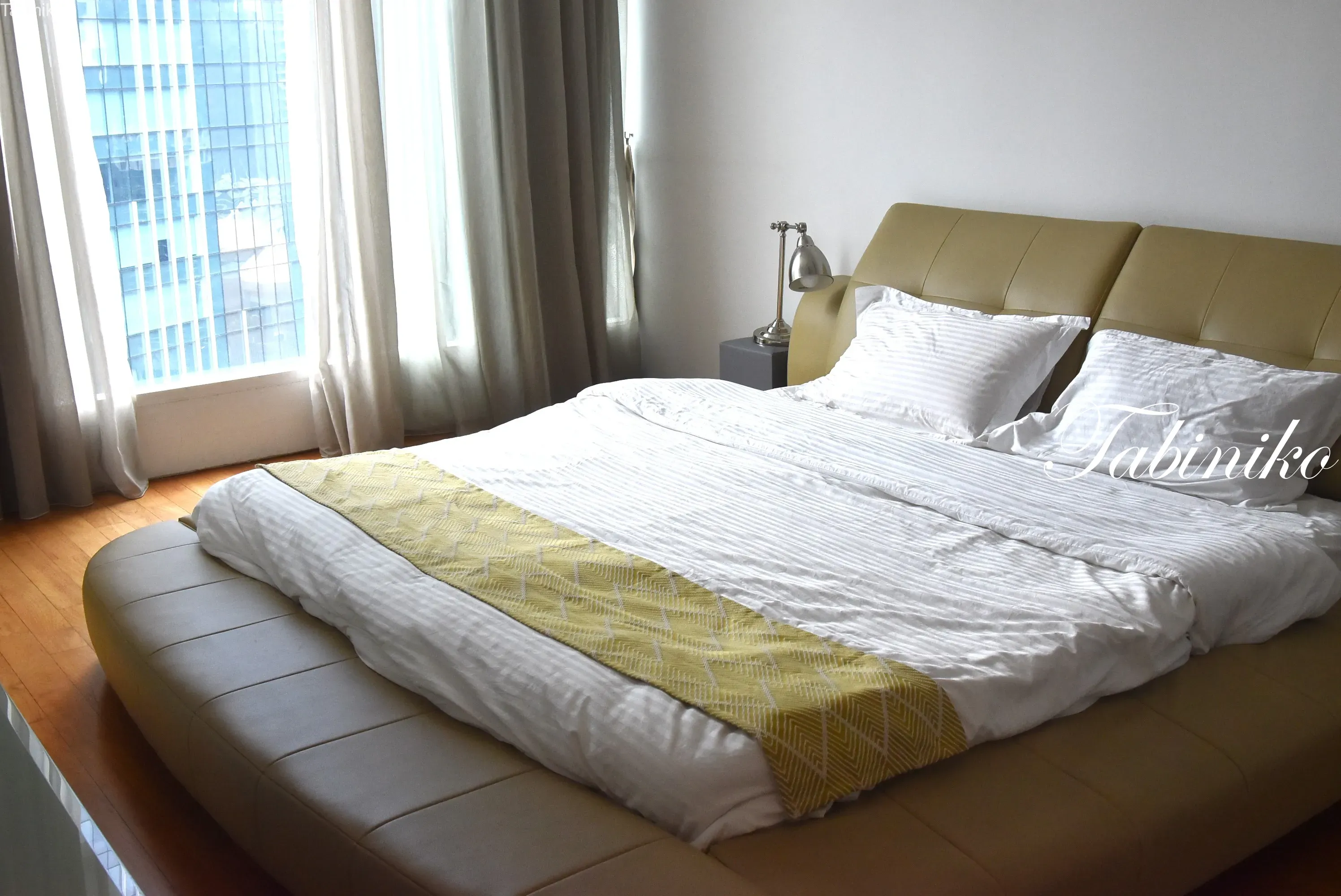 キングサイズのベッド。こちらの部屋も採光性抜群!床が木のフローリングなのもいいですね。