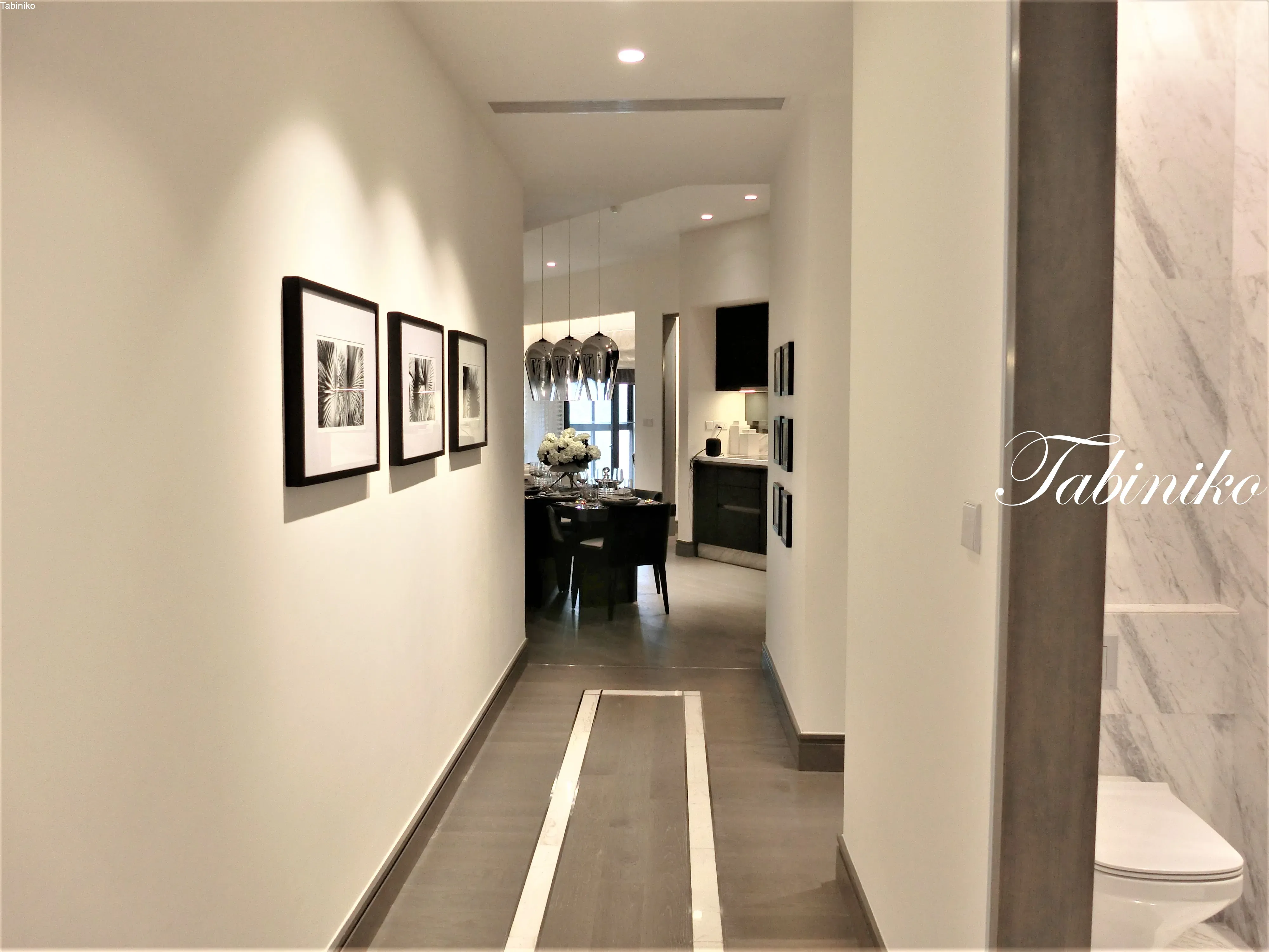 进入入口后,是走廊和客用卫生间。 走廊可以挂上漂亮的图片和照片,就像室内设计一样。 我想放一张家庭照片和一张旅行纪念照片。 客用卫生间是大理石墙(请确当地认材料),很有豪华感。