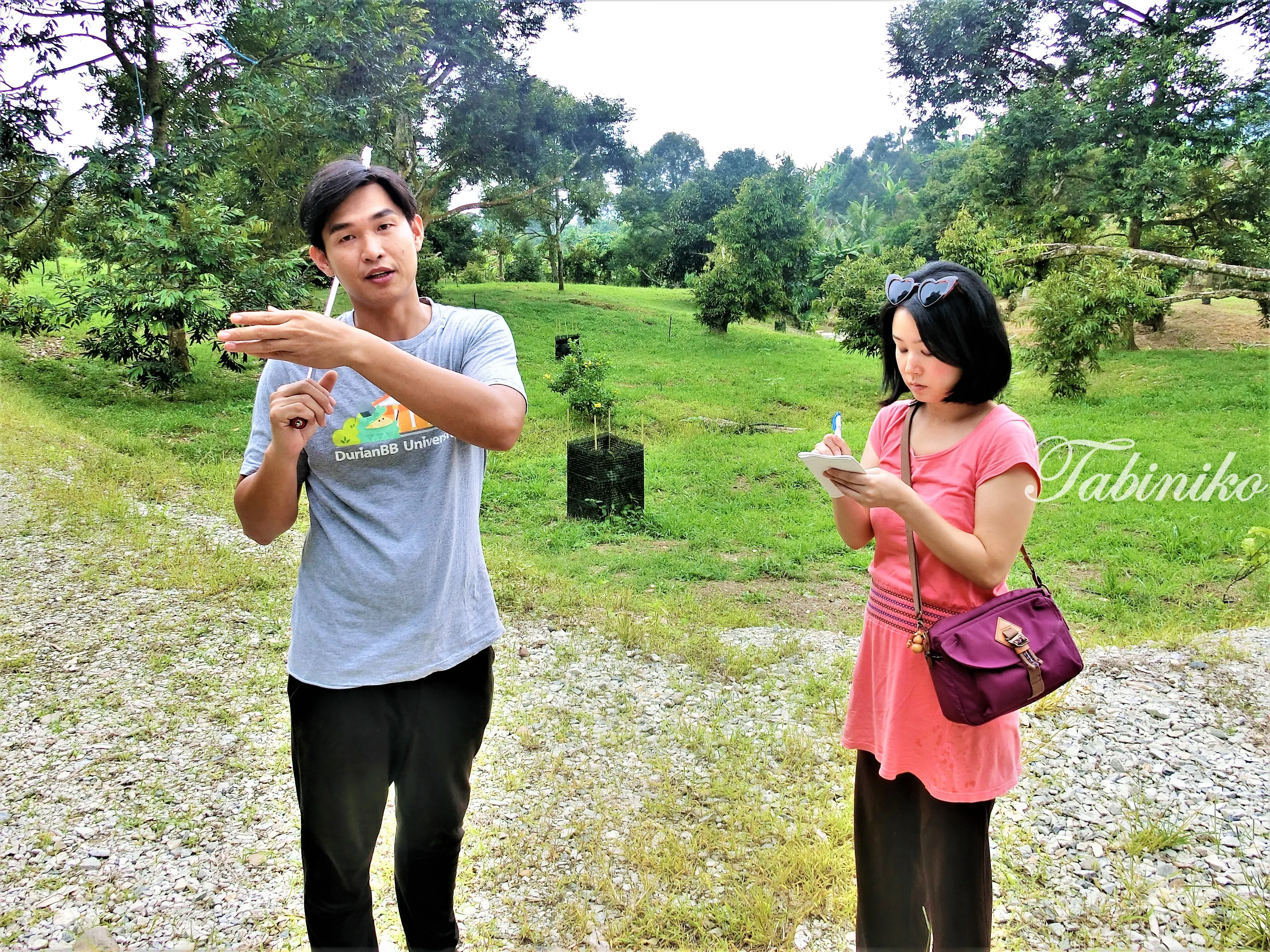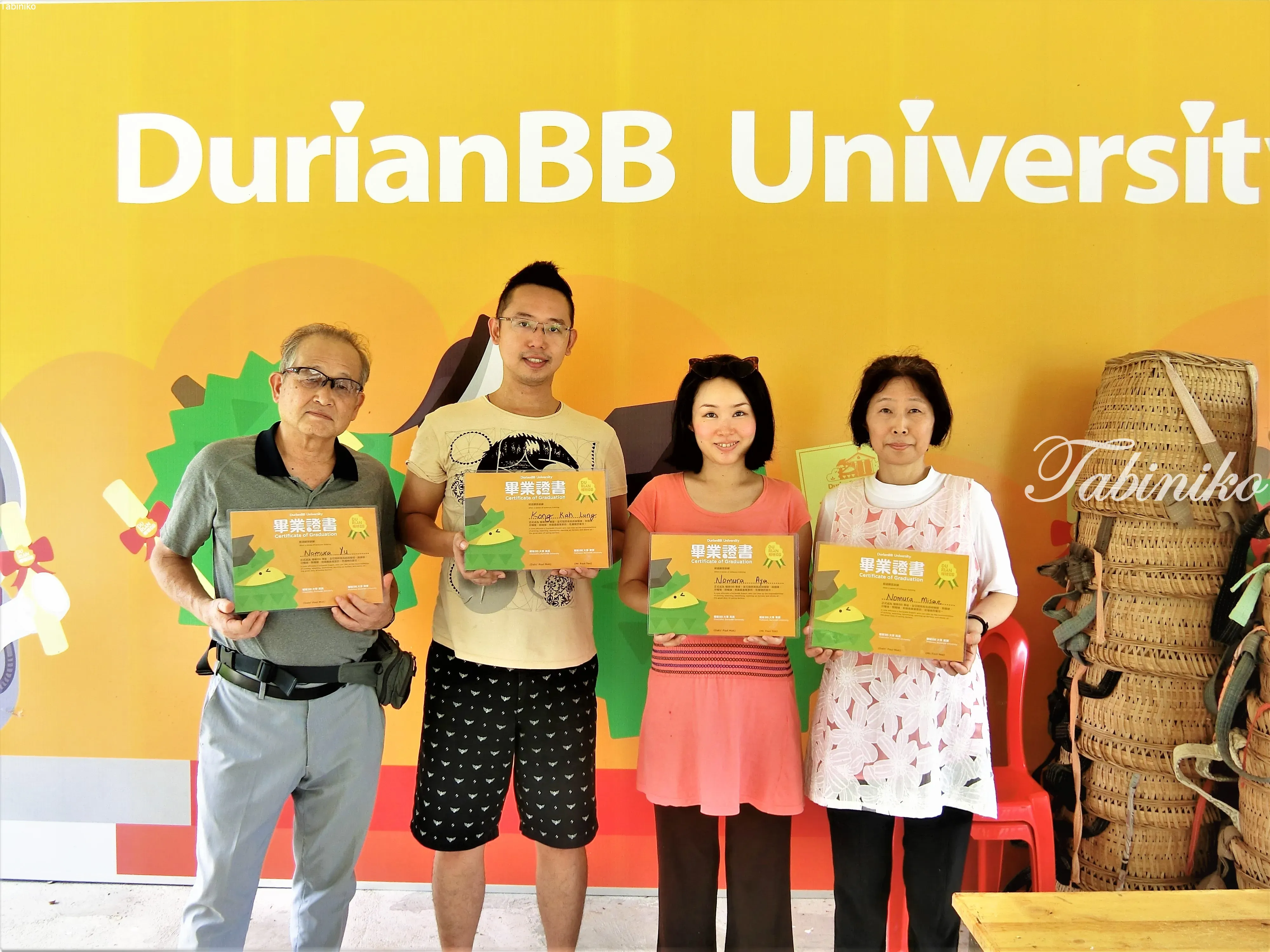 当您到达榴莲BB农场时,您将变身成这样,并全副武装准备捡起从树上自然掉下来的榴莲。这是吃马来西亚榴莲的方法。泰国榴莲通常被爬树的人采摘,这与马来西亚相反。 从树上自然掉下来的榴莲比超市里出售的榴莲更新鲜更美味!味道是完全不同的! 恩,榴莲BB农场?是教室?什么意思呢?让 TABINIKO 团队进行解释吧。 其实 “榴莲BB大学” 是一种旨在提高广告效果的策略。