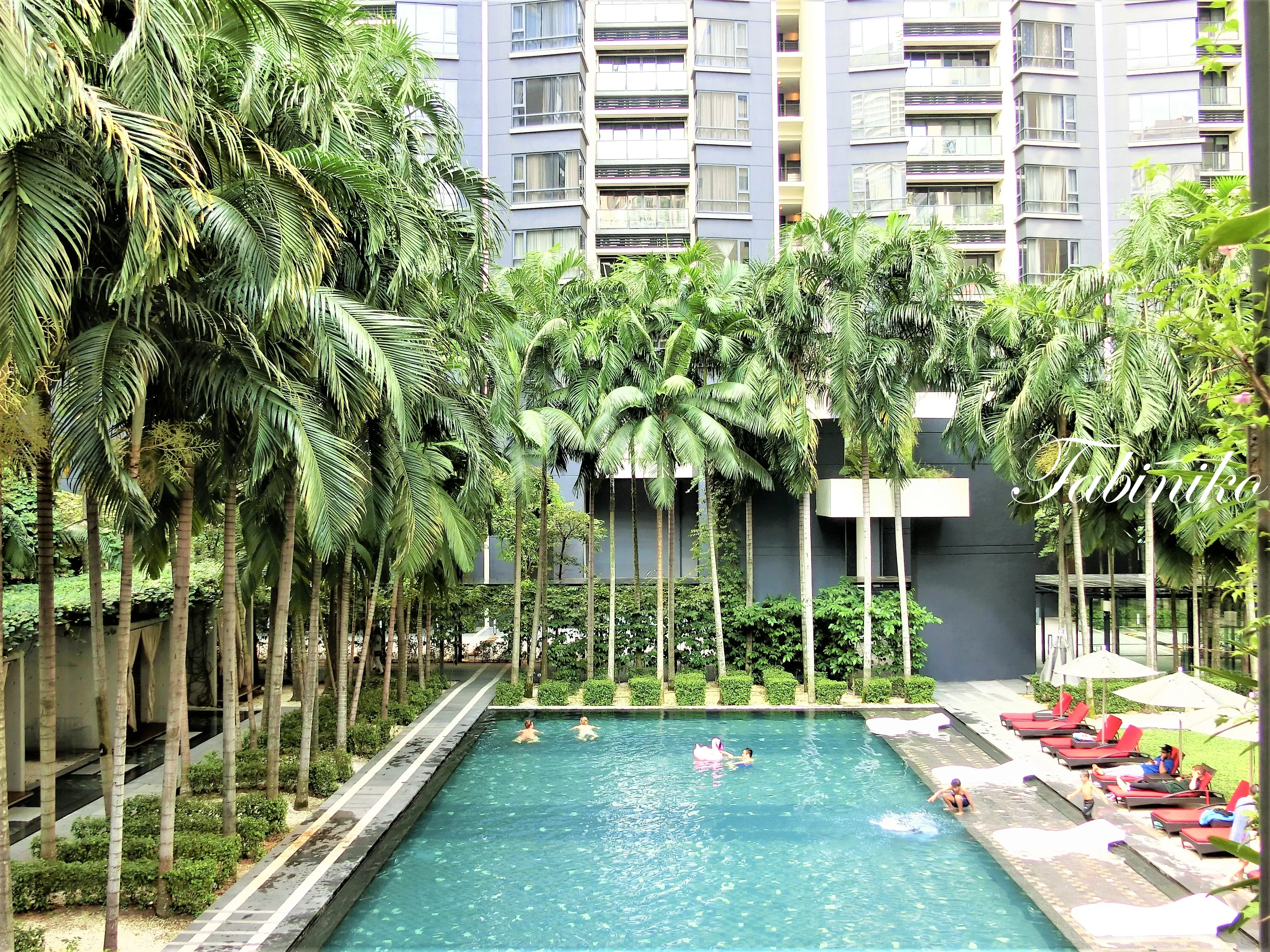 设施内满满的绿植治愈你(#^.^#) 虽然是吉隆坡的中心,却满眼都是绿植!不愧是南国!泳池边的棕榈树!还可以看到双子塔。 外花园还有一个大秋千,可以看书或小憩,感觉很棒☆ 这里有很多守卫,他们会很礼貌地和你打招呼,治安很稳固很安全!