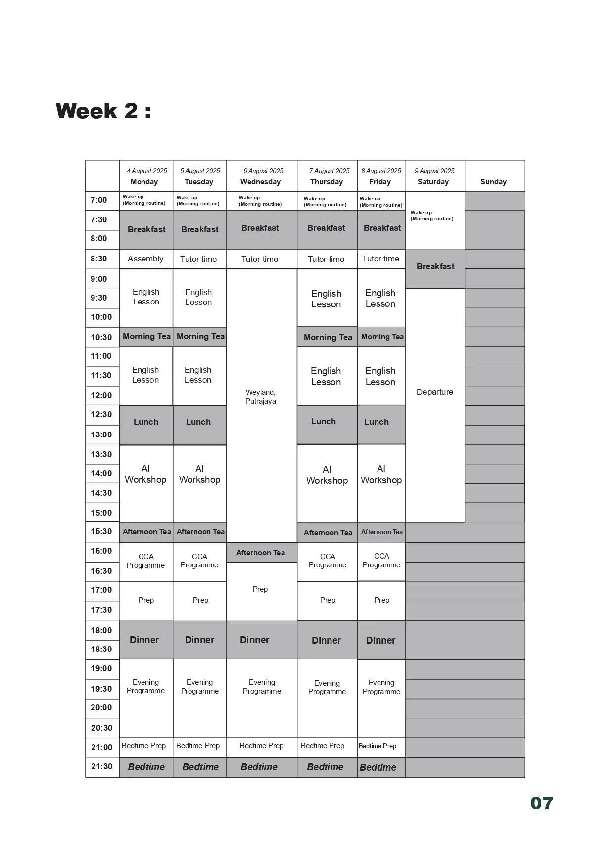 抵达 – 2025年7月27日学生将在2025年7月27日抵达夏令营。当天提供接机服务,时间为早上7:00到晚上9:00,KLIA 1 和 KLIA 2均提供接送服务。请注意,晚上9:00之后将不提供接机服务。我们恳请所有学生确保在此时间范围内到达,以确保顺利过渡进入夏令营。我们热切期待欢迎大家度过一个激动人心的夏天!🌞✈️