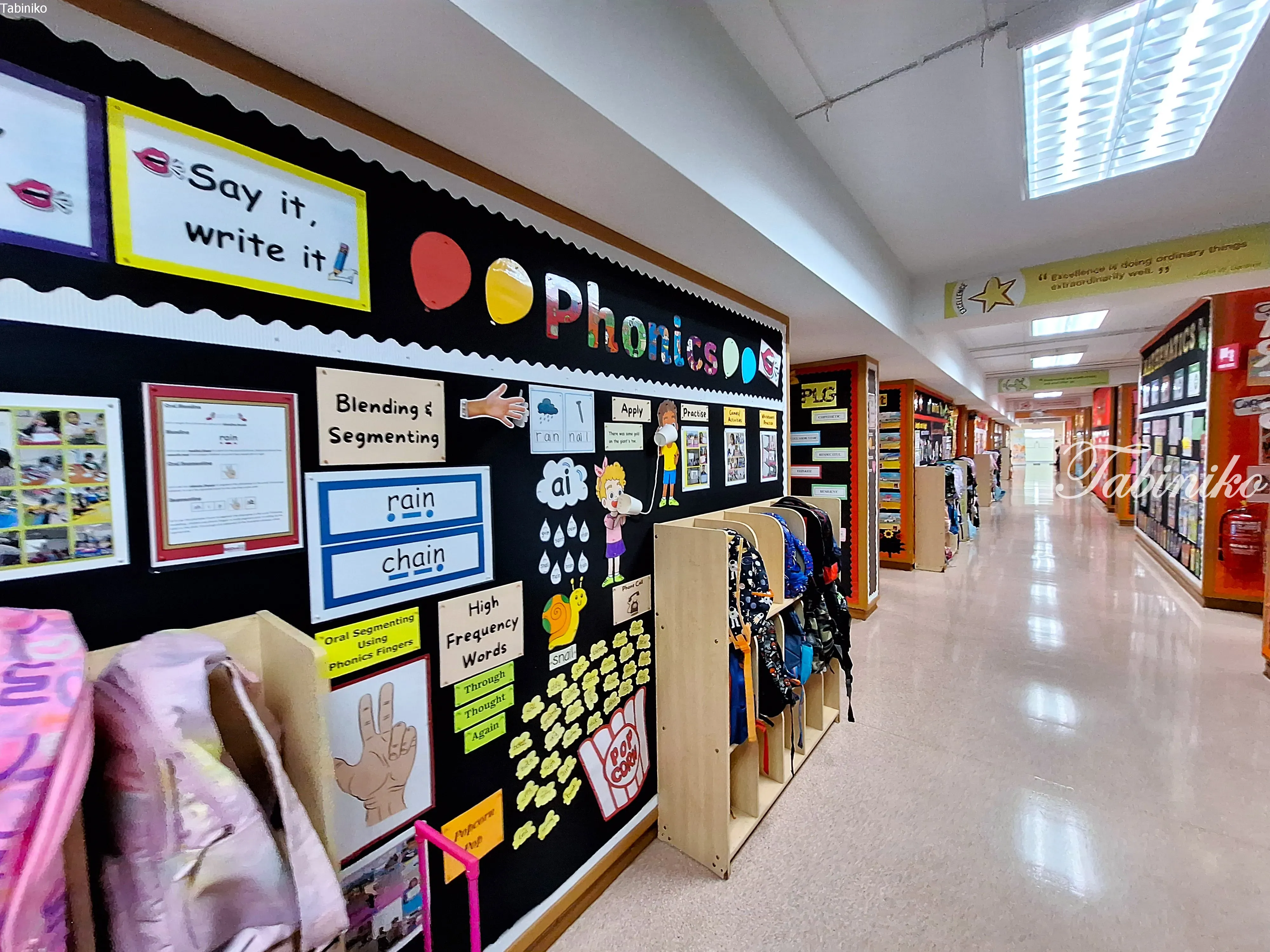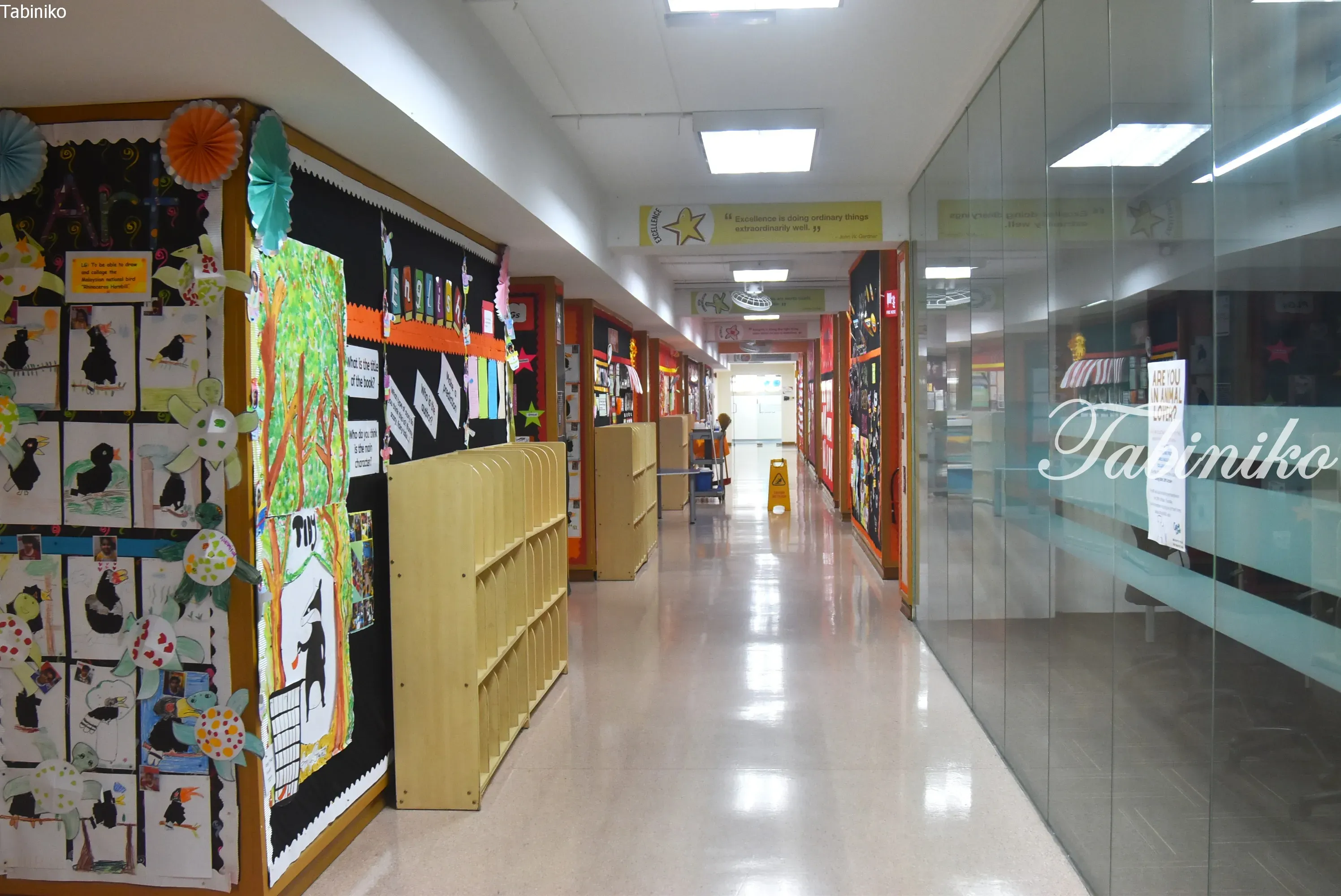 走廊的墙壁完全被展示内容覆盖了 (#^.^#)。如果没有这些展示,走廊可能会显得有些单调,但有了色彩丰富的公告板,学校的氛围变得更加明亮和温馨。它们也展示了学生正在学习的内容,我认为这营造了一个非常积极的环境。