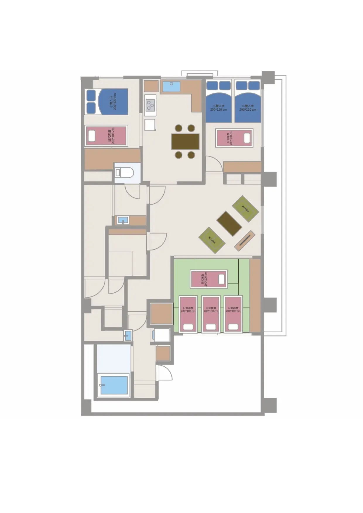 → 可额外增加 3 至 4 个日式床垫(100cm × 200cm)