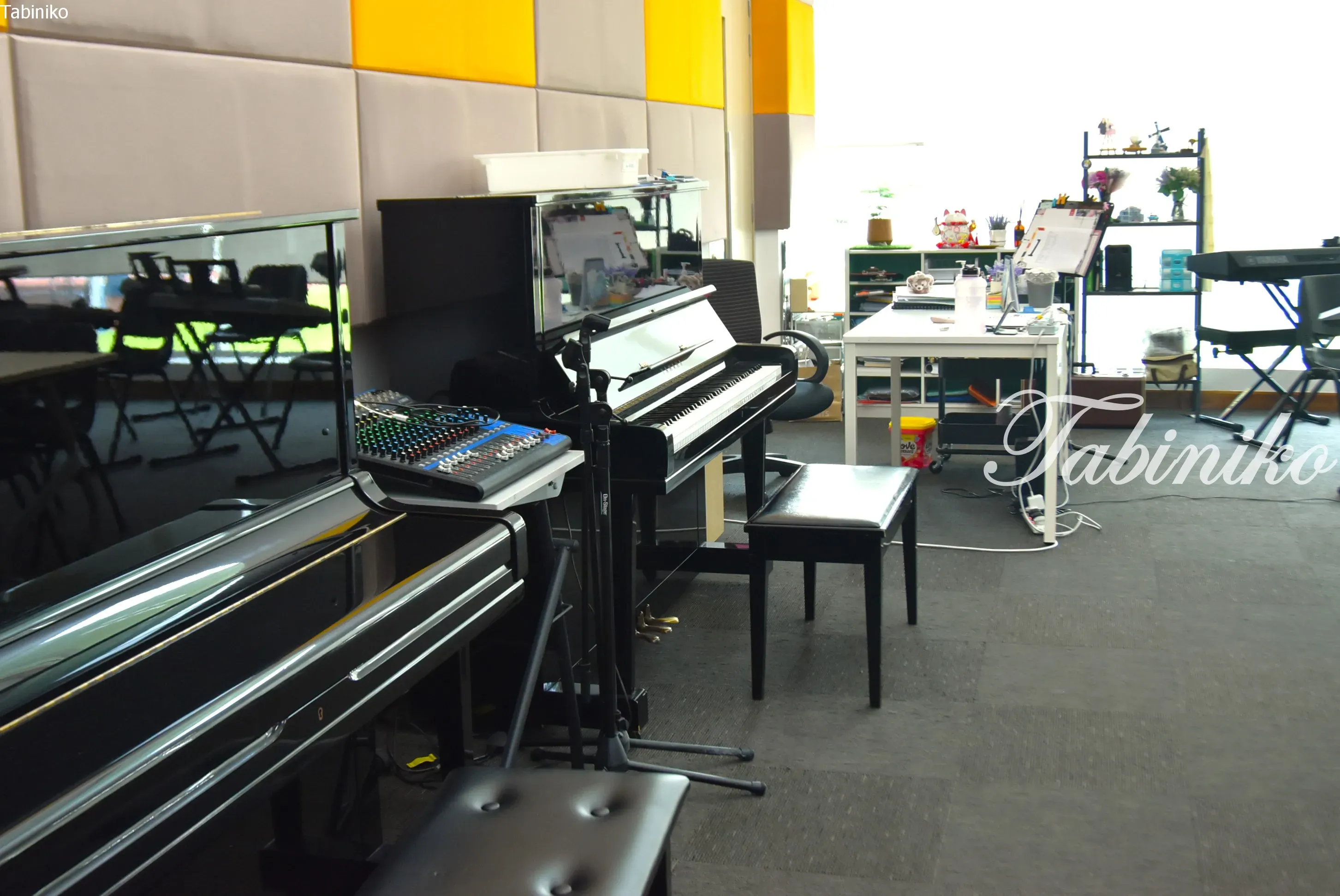 这个教室配备了立式钢琴、电子钢琴和鼓。部分墙壁经过了隔音处理。