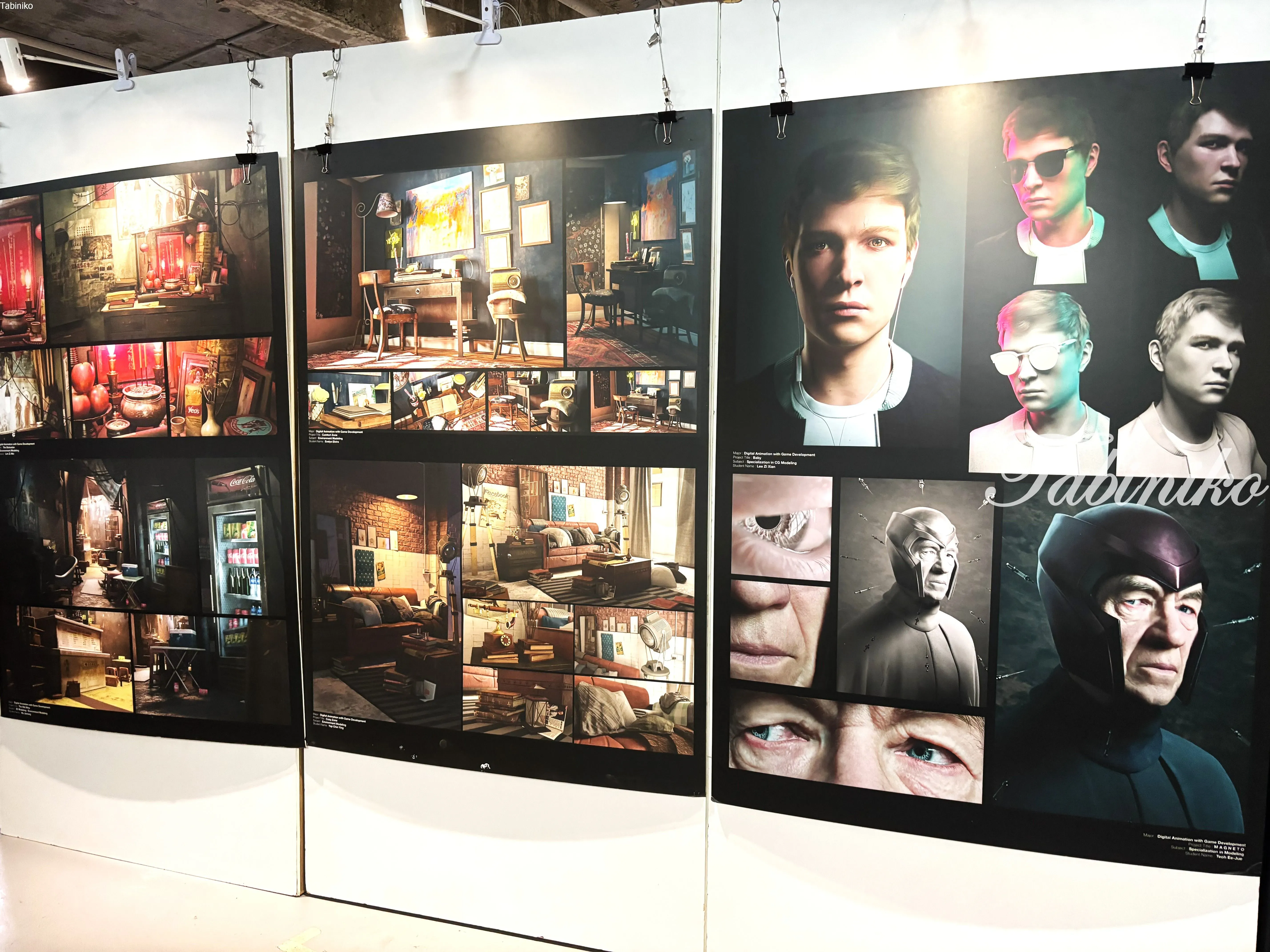 这是通过3D建模(在电脑上制作立体形状的技术)来学习制作电影或游戏插画的课程。走廊里展示了许多出色的作品。