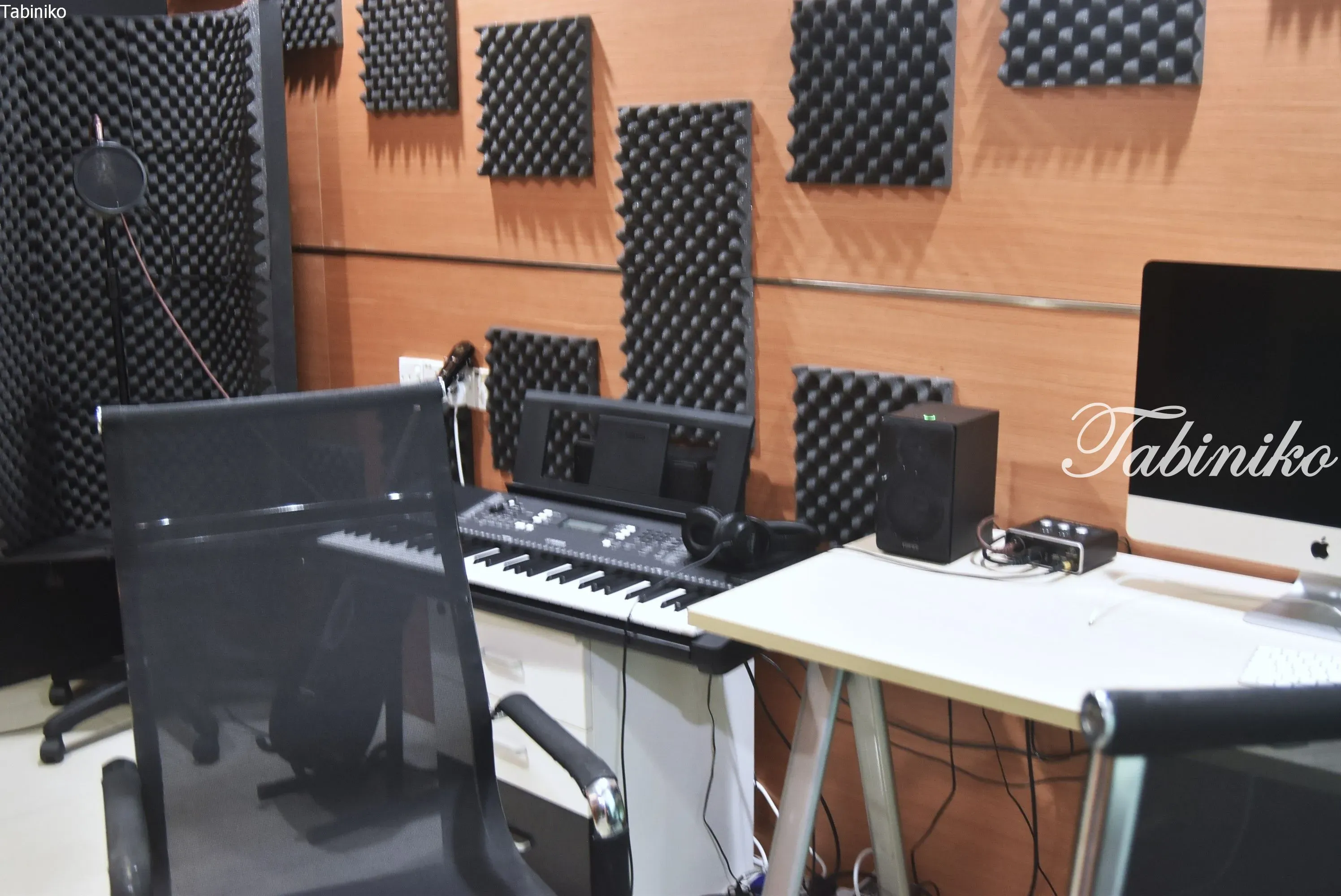 这是一个配备了录音设备、Mac电脑、电子琴和隔音墙的录音室。