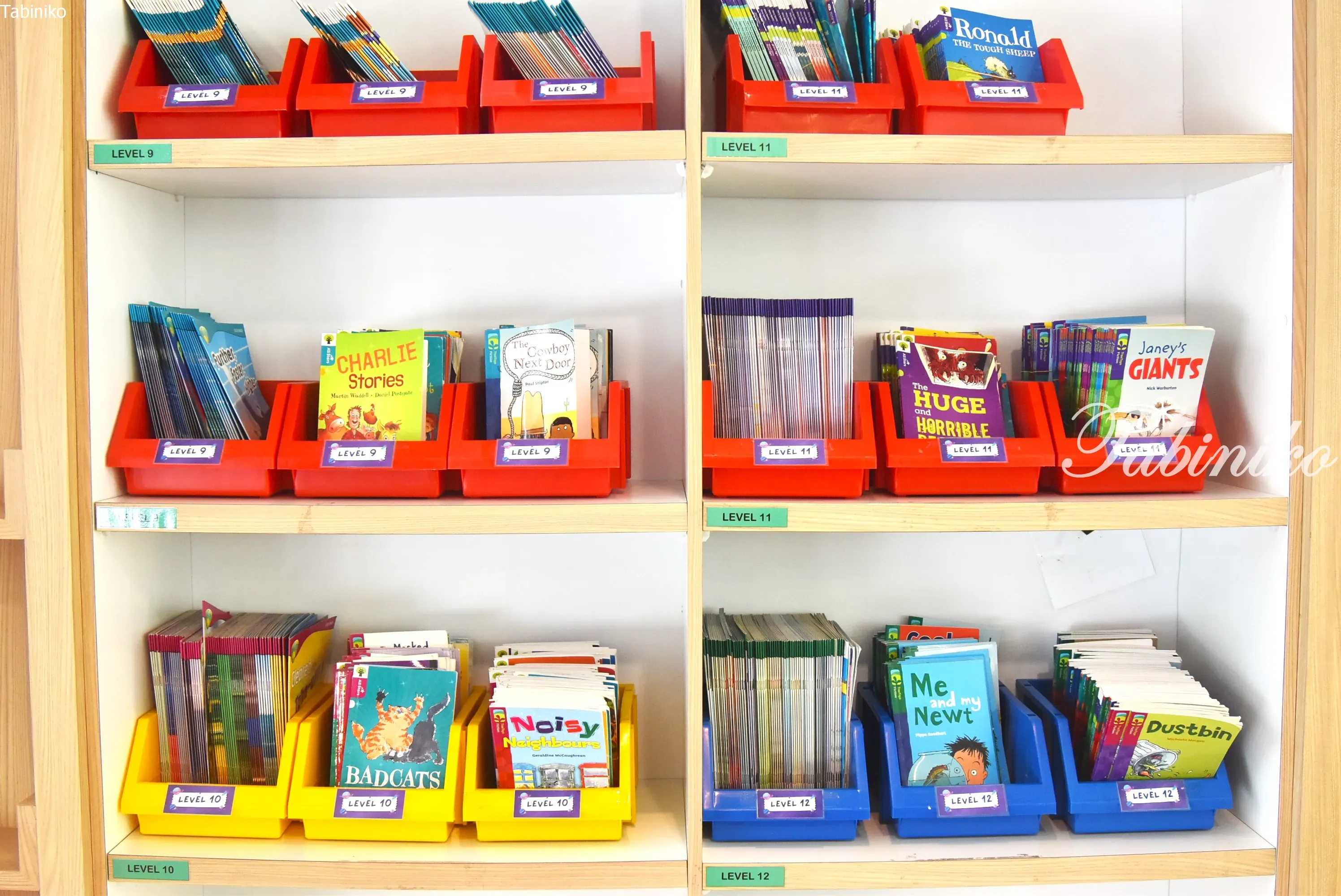 書籍按級別分箱:紅色、黃色、藍色、綠色等。