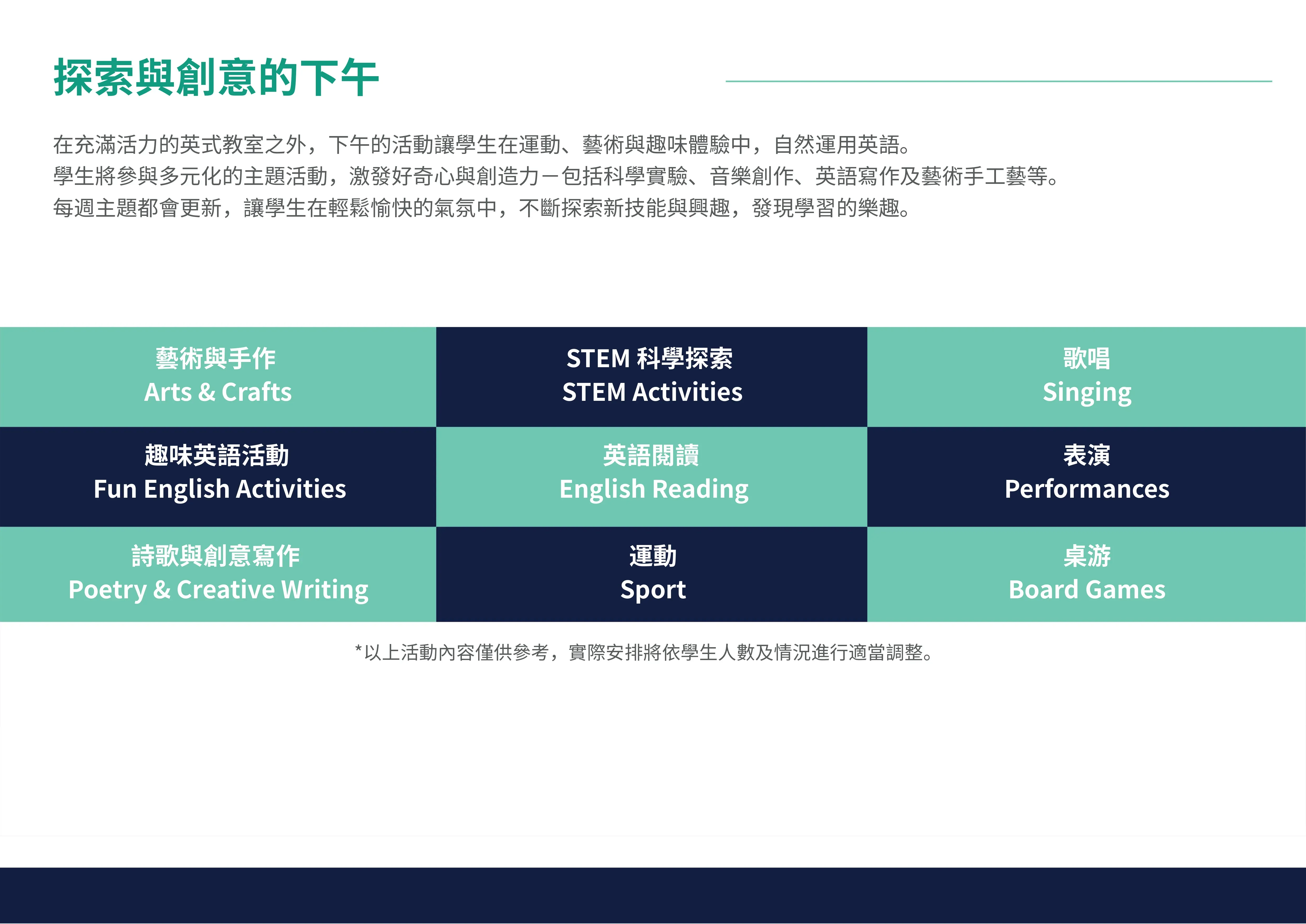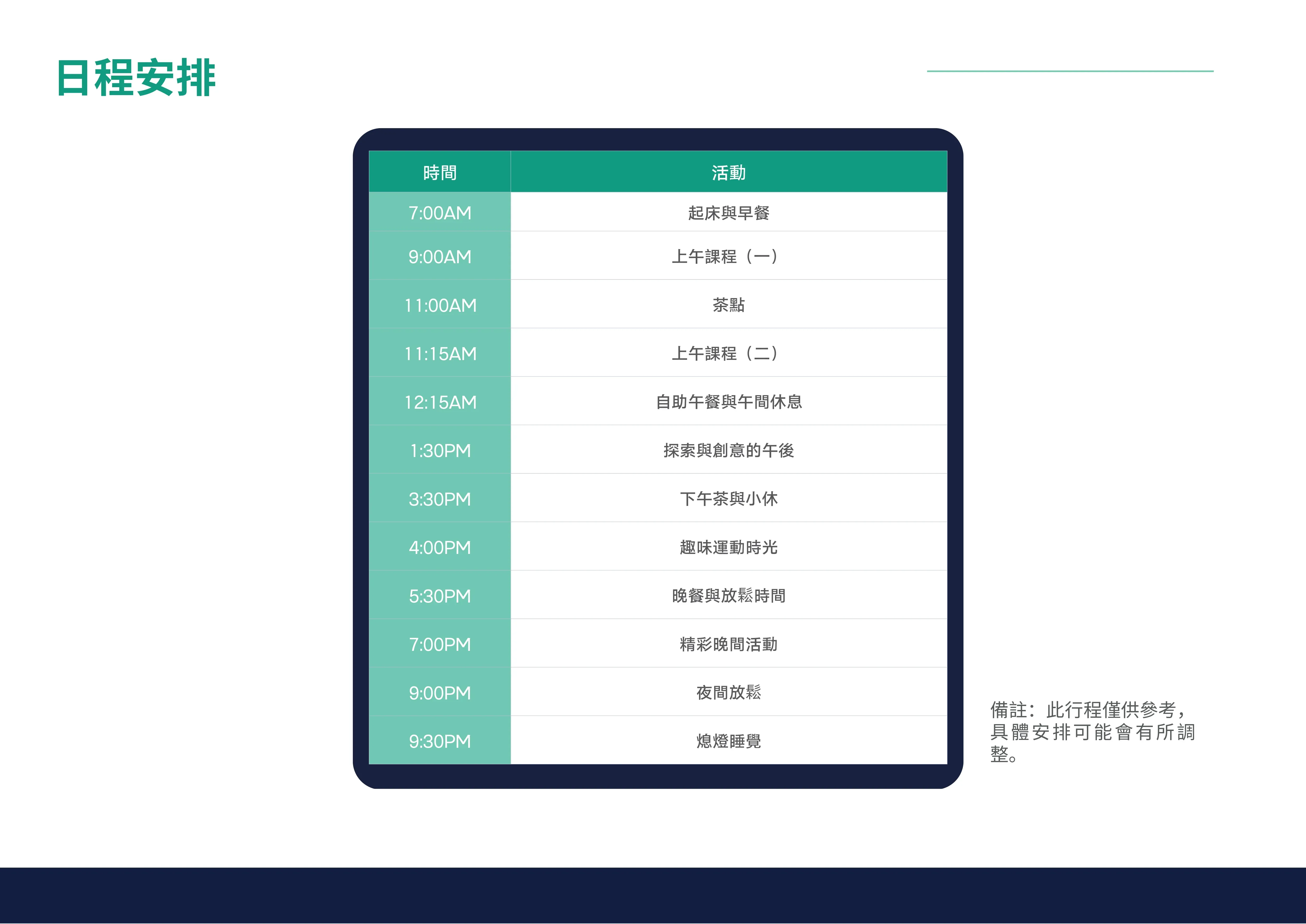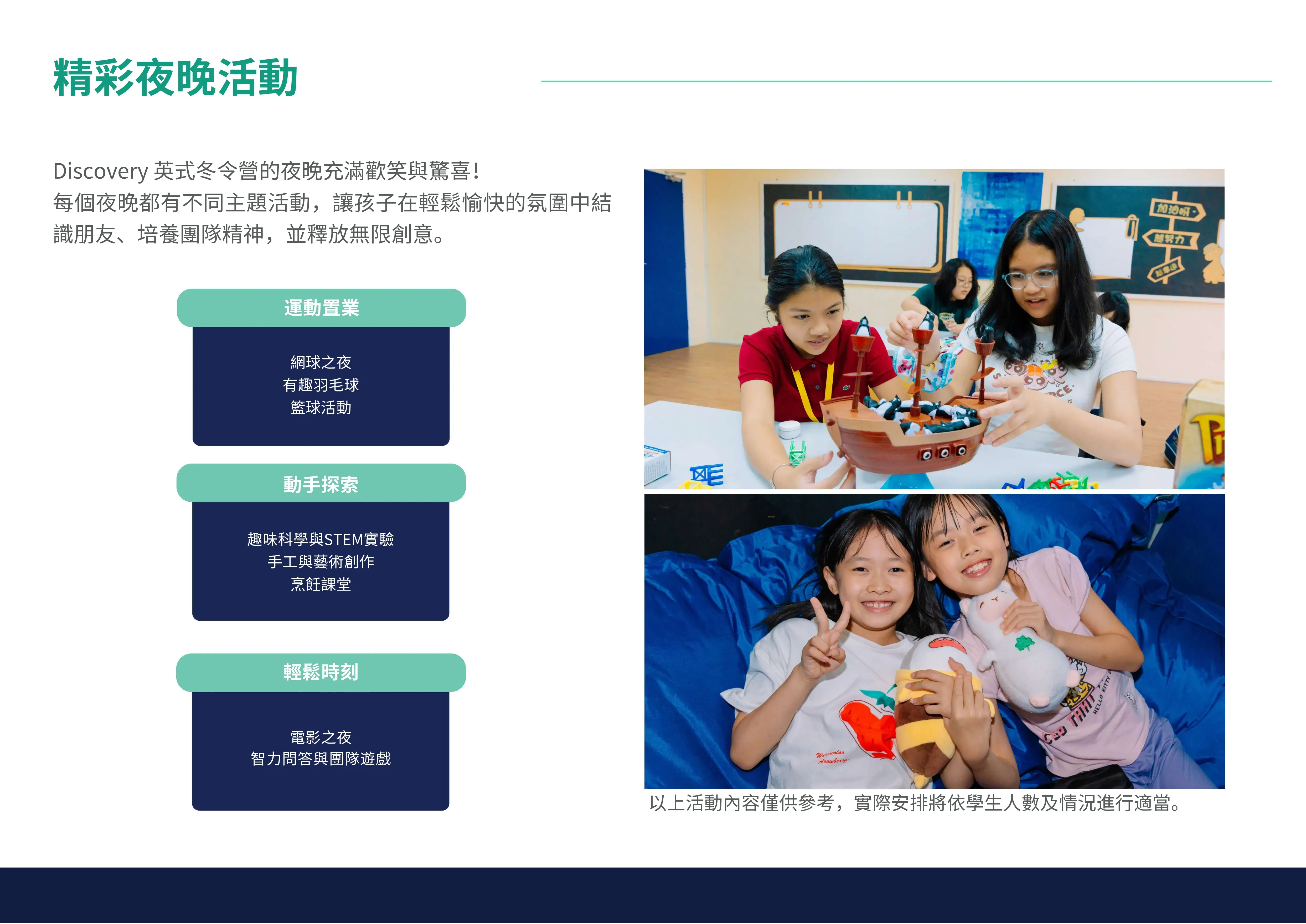 課程從晨間學術課程到晚間活動 全程採用英語授課與交流,