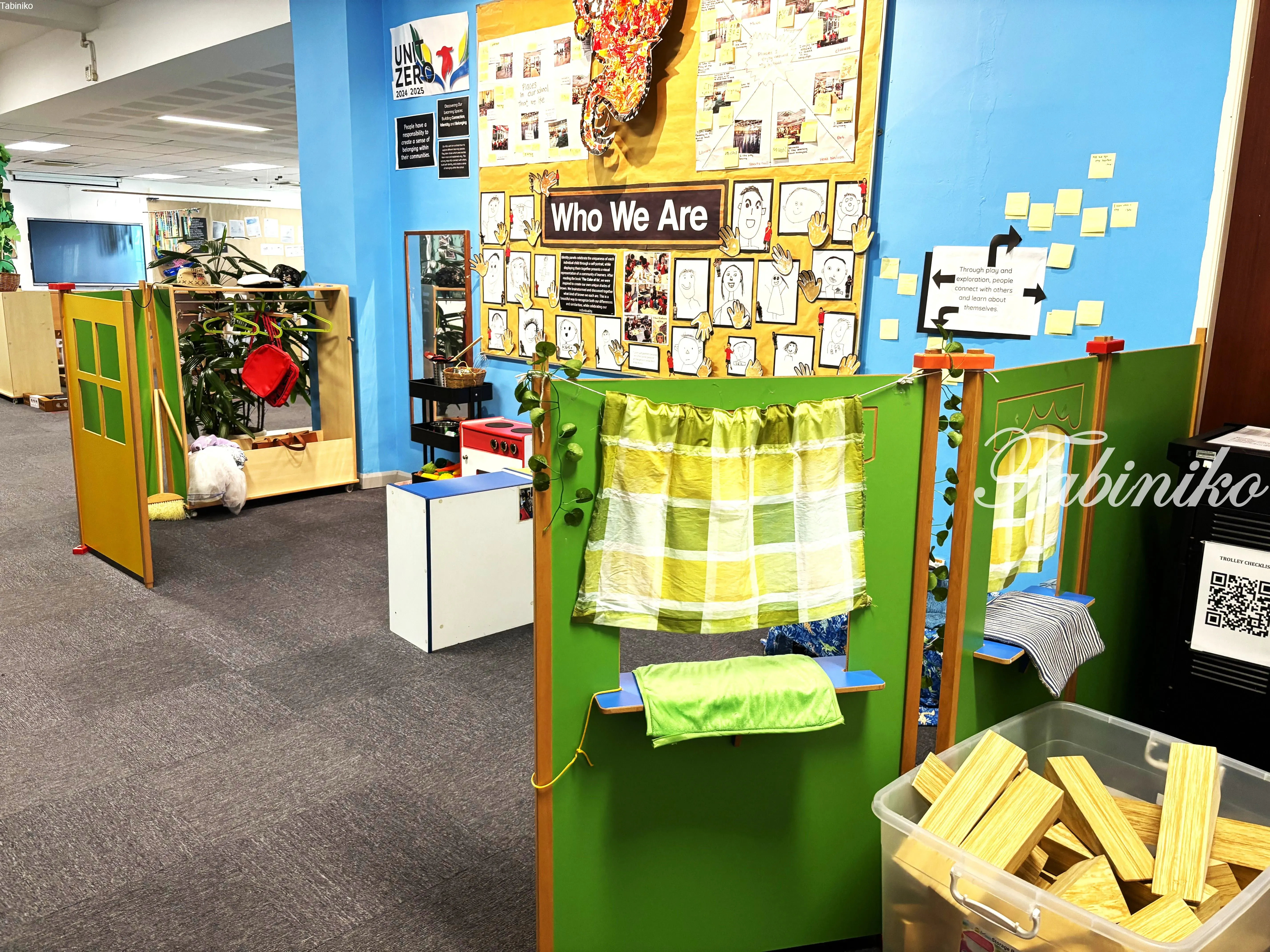 小學教室旁邊有一個共享空間,擺放著各種益智玩具。
