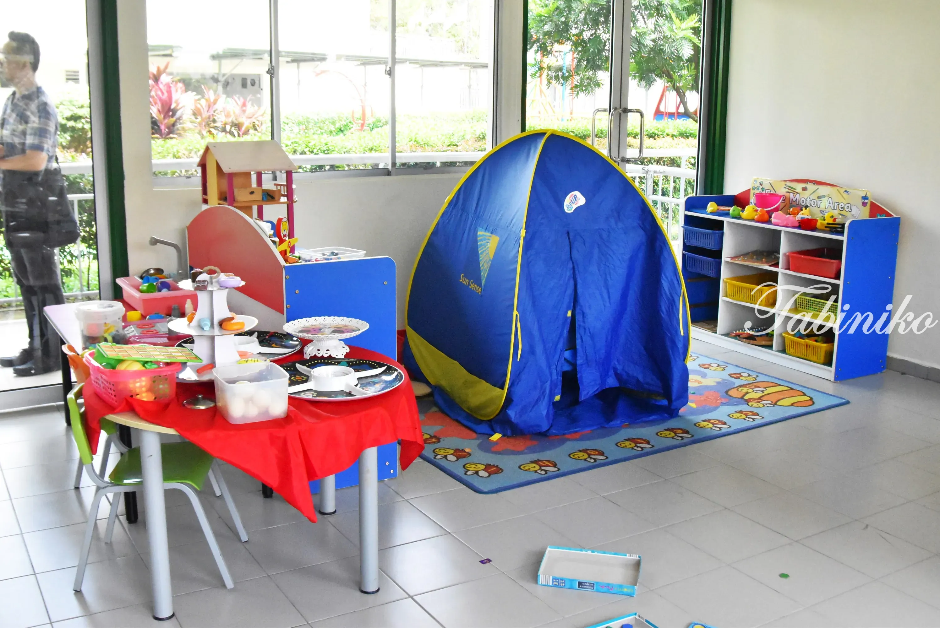 有真草坪,是一個色彩豐富的遊樂場。左後方帶黃色屋頂的建築是幼兒園教室。