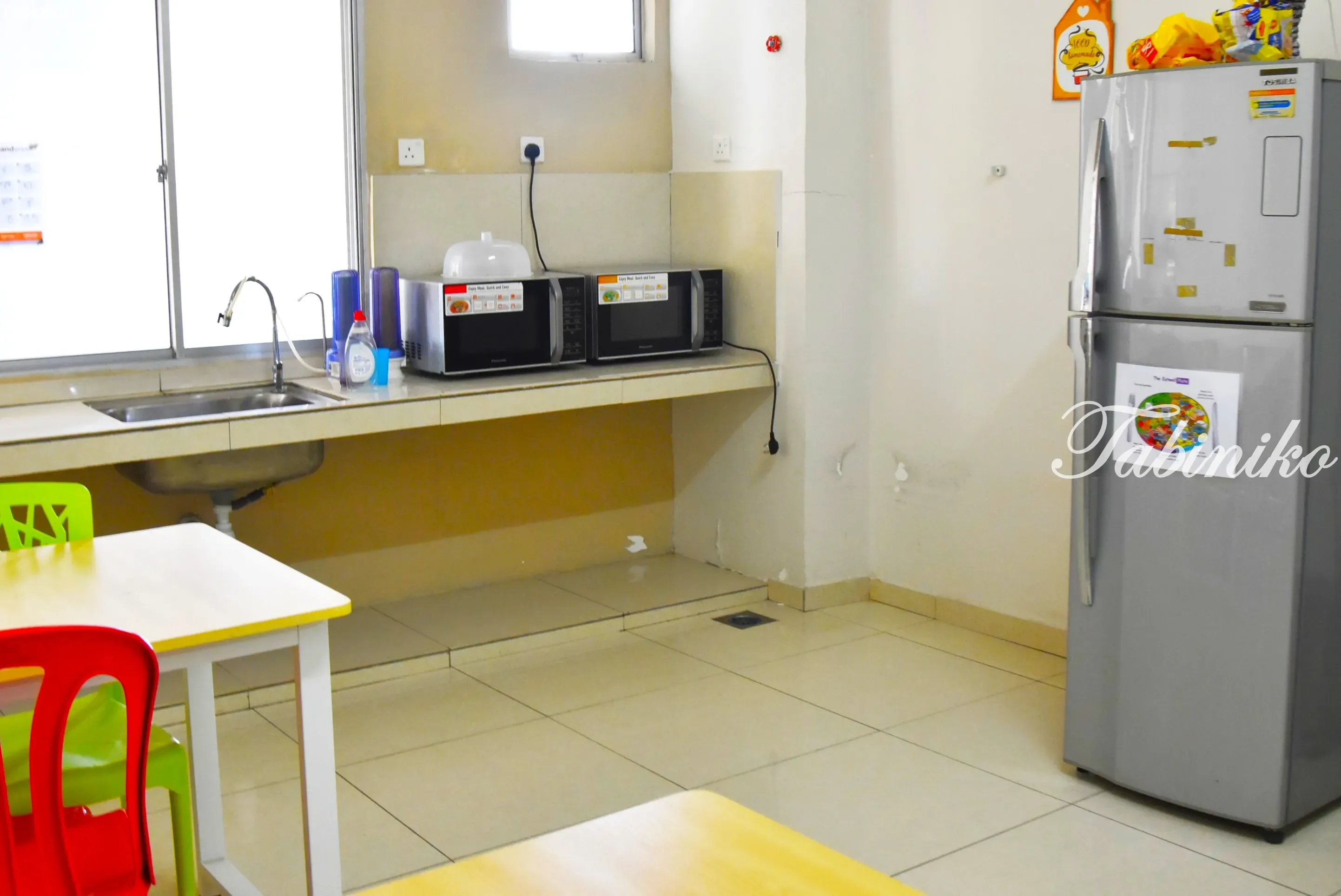還配有微波爐和冰箱。
