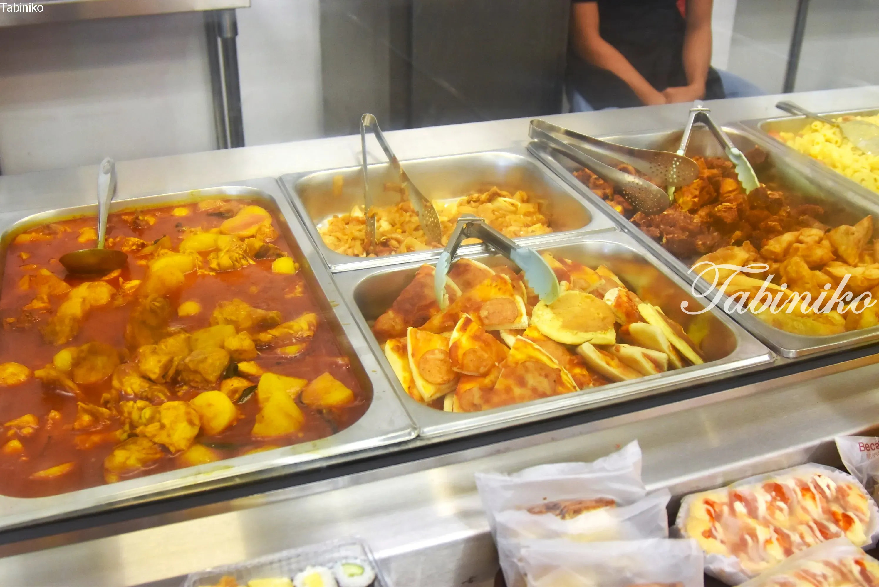 這家自助餐廳的菜品種類不多,但提供了基本的選擇,包括蔬菜、肉類、米飯和義大利麵。