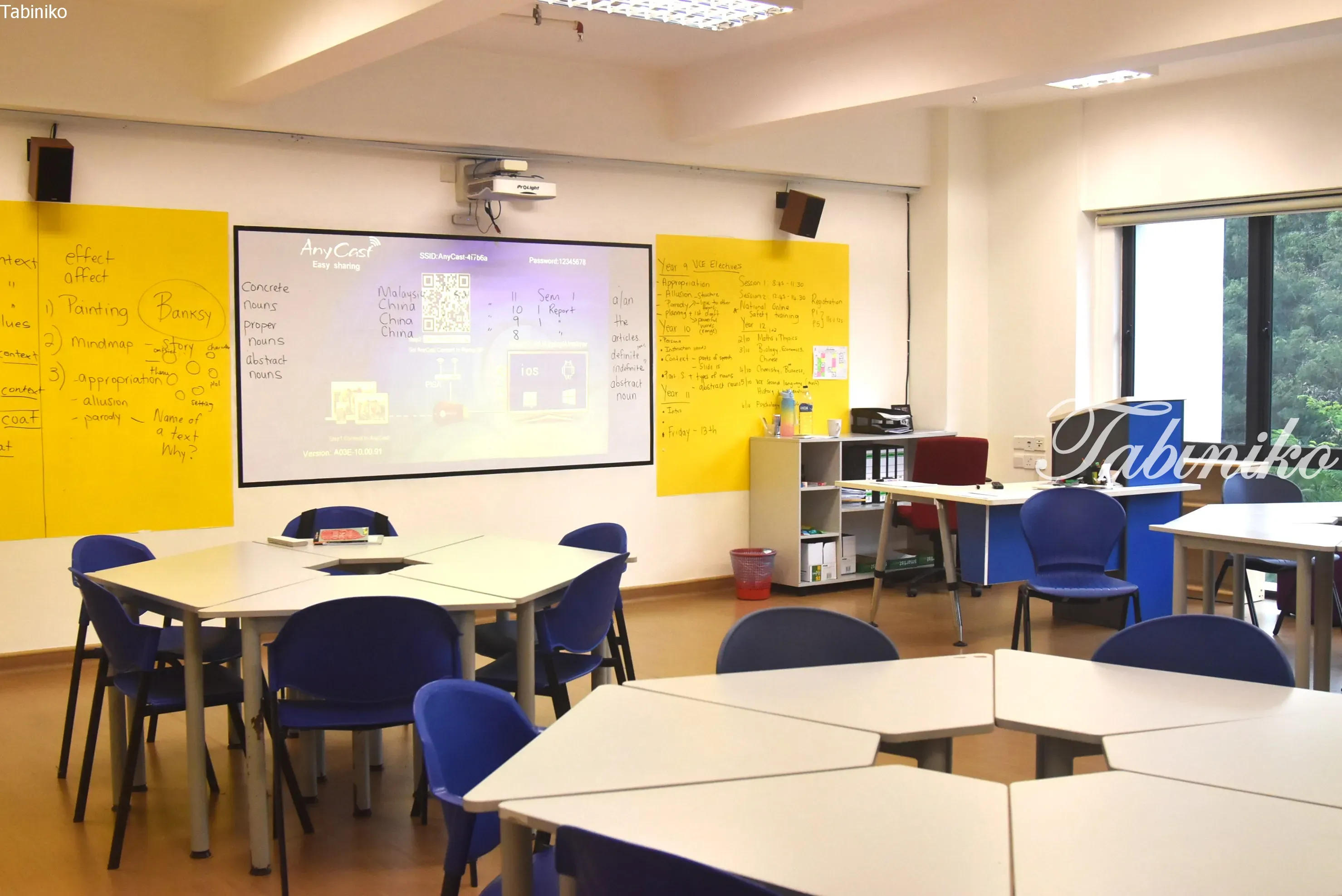 桌子排列的方式使每個人都能參與討論。這種佈局在日本學校中不常見。