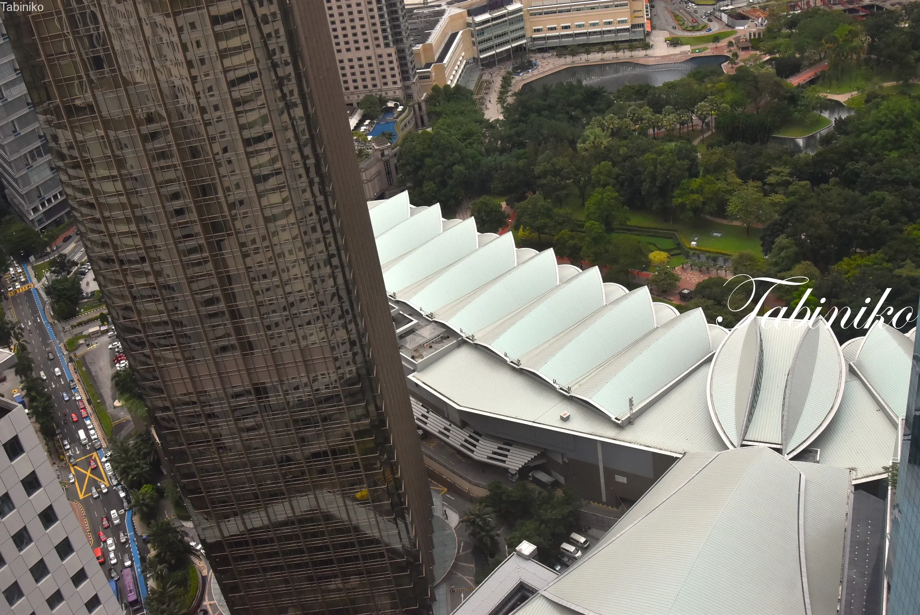 白色屋頂的建築是雙子塔的展覽館,後方的樹林是 KLCC 公園。