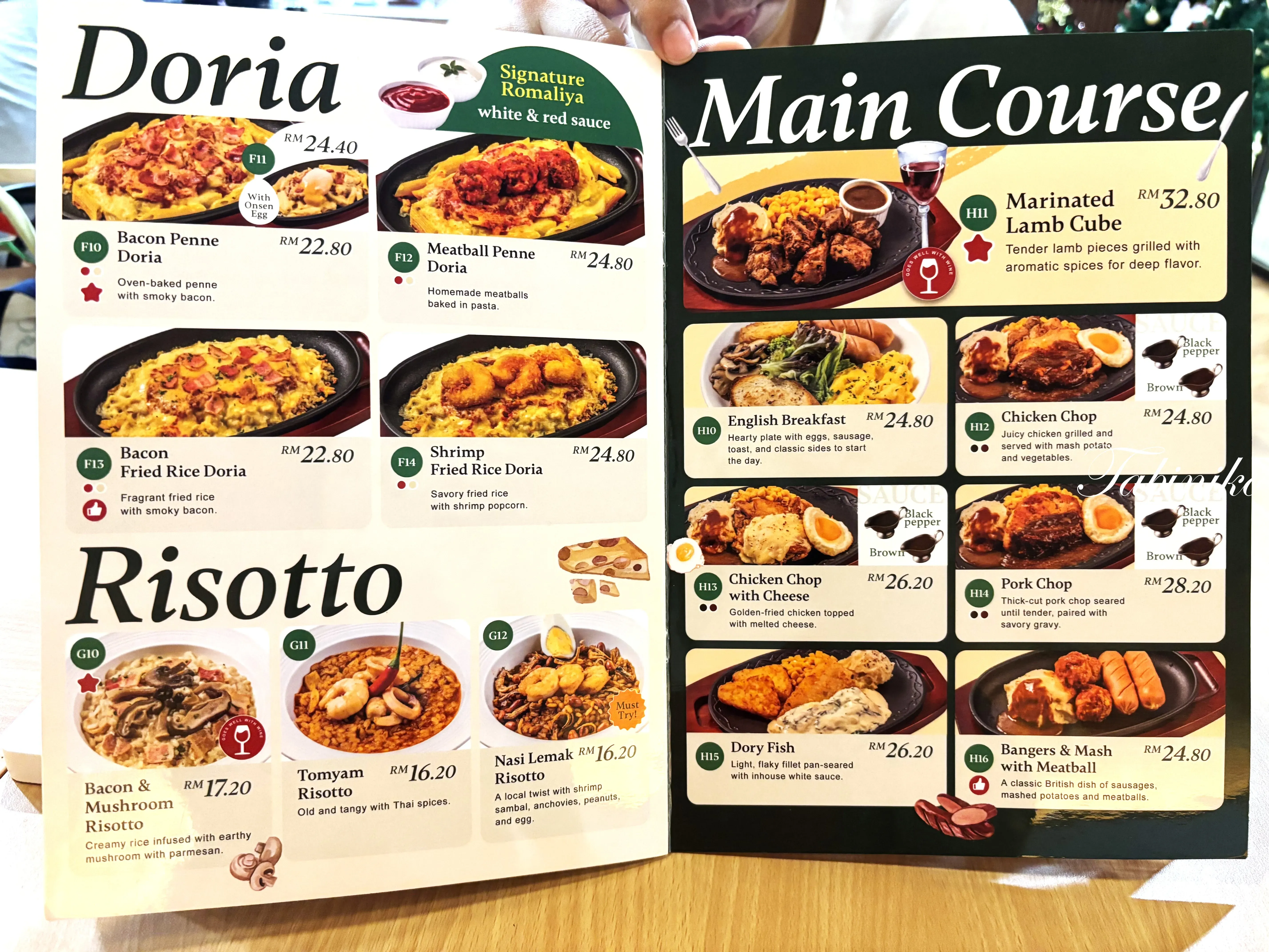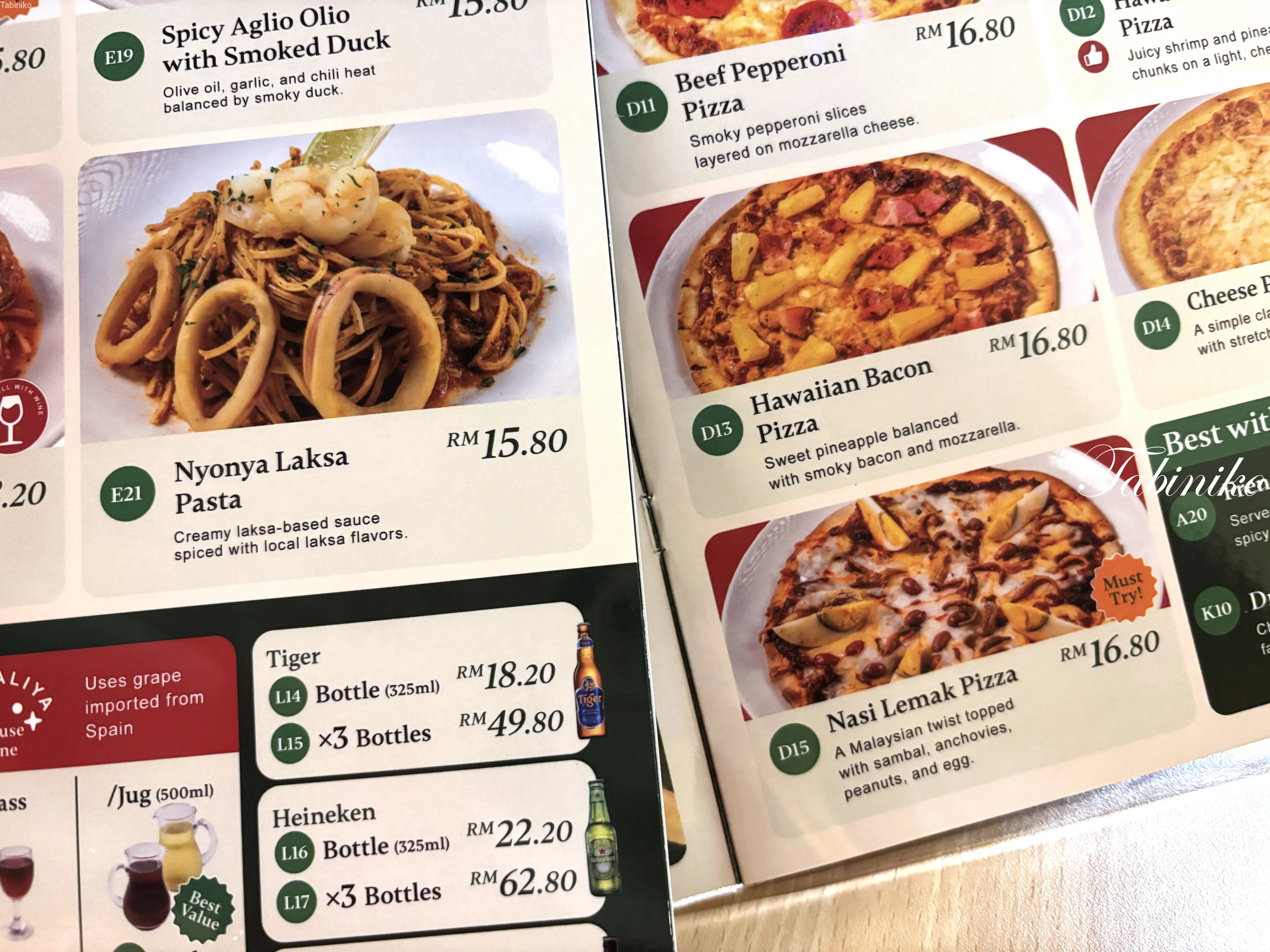 菜單上還有本地化的菜品!例如 娘惹叻沙意面 (RM15.80) 和 椰漿飯披薩 (RM16.80)。這些都是結合了馬來西亞本地美食改良而成的「只能在這裡吃到」的特色菜。