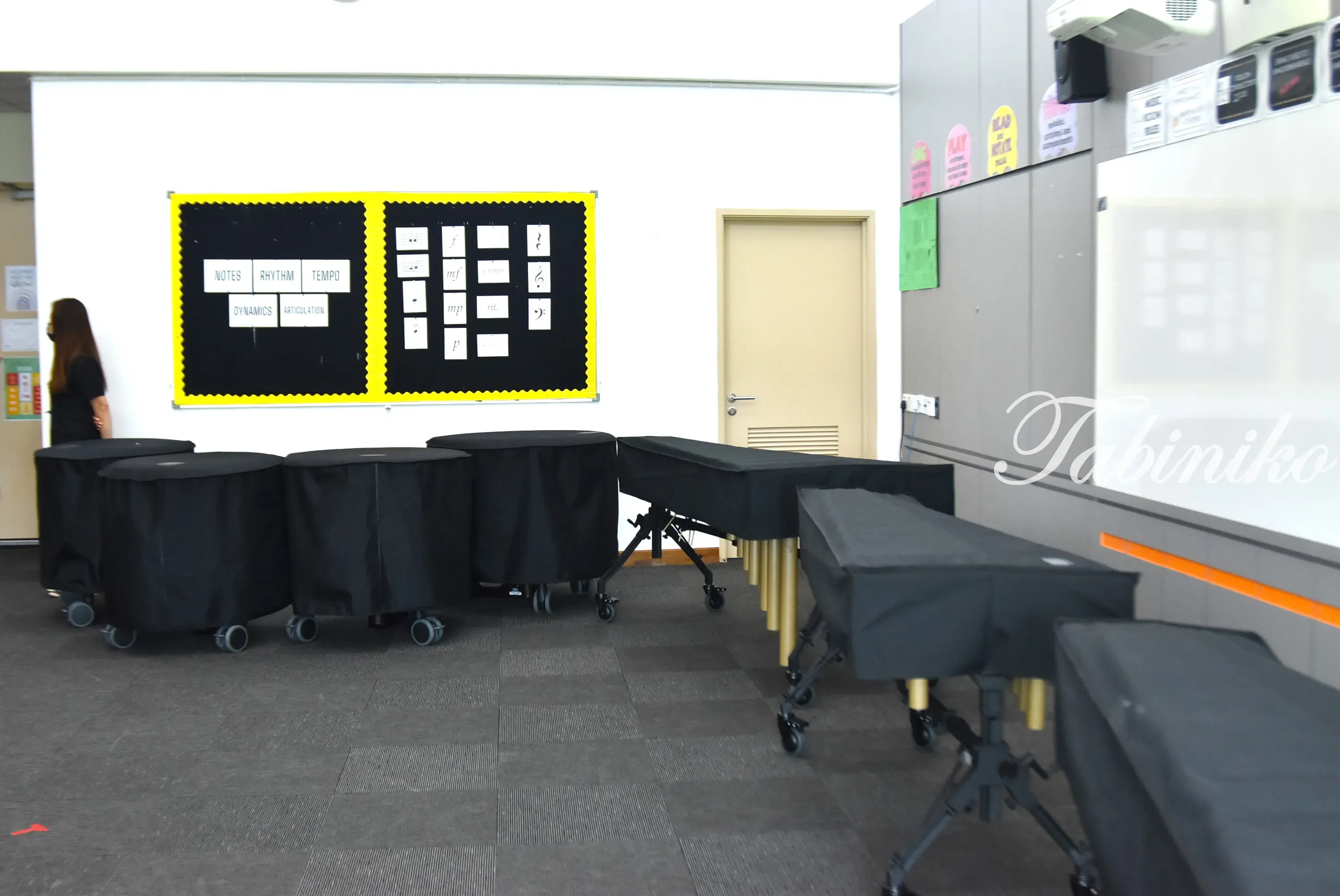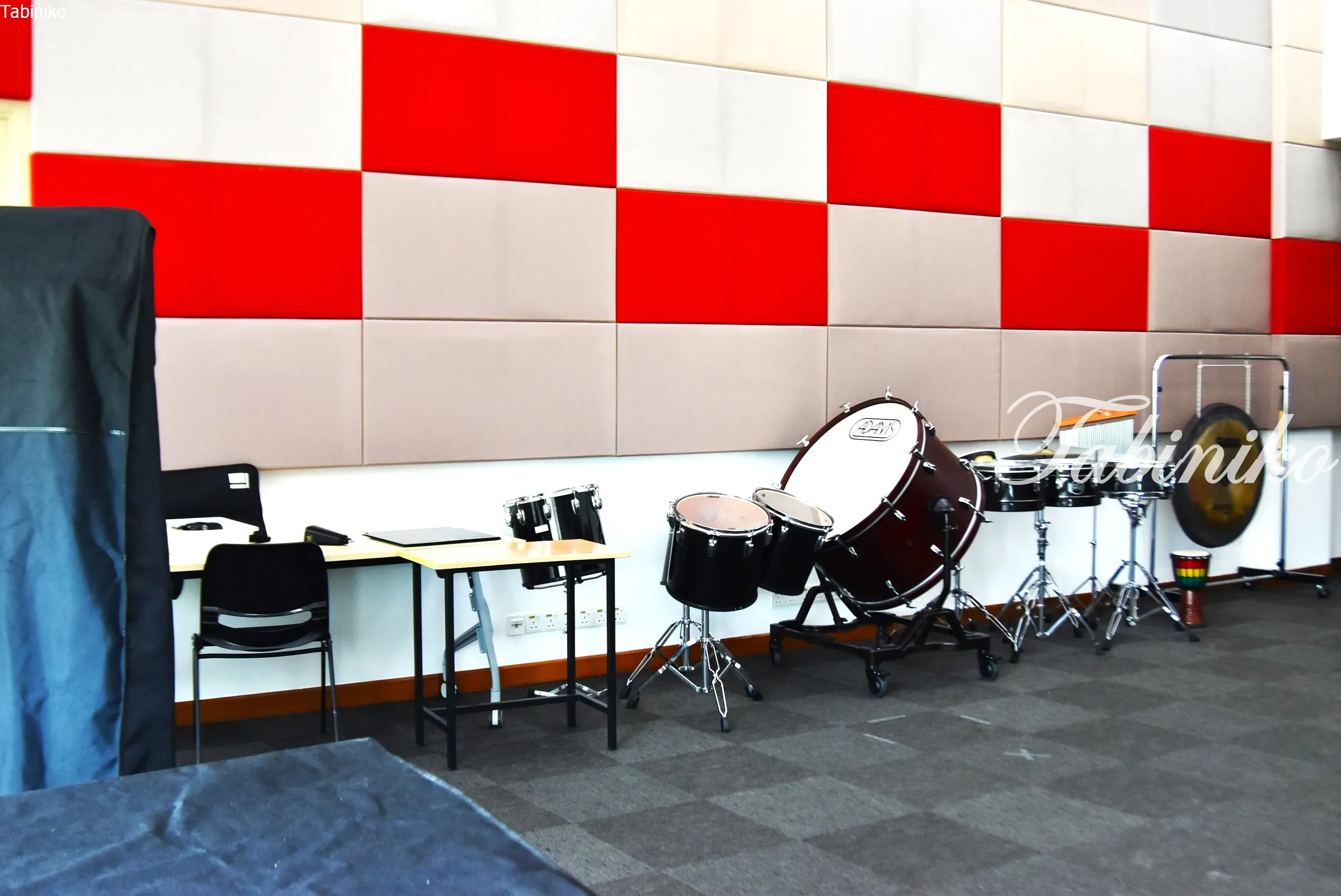 這個教室裡有許多打擊樂器,部分牆壁也經過了隔音處理。